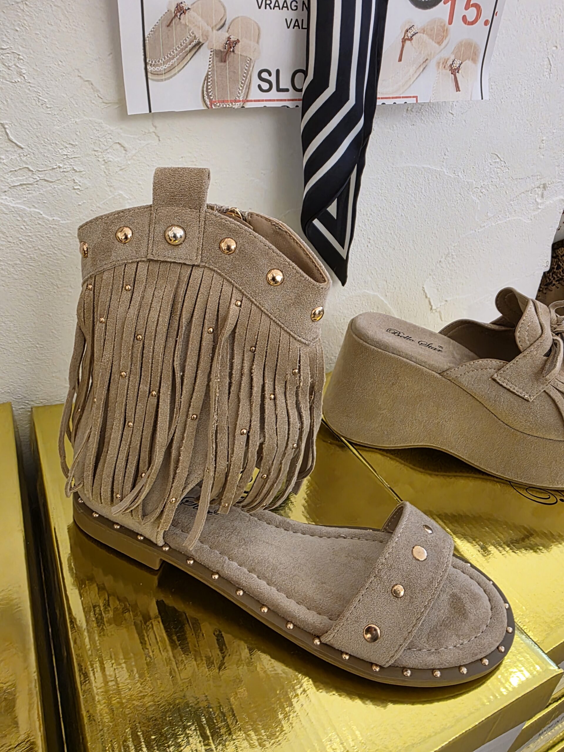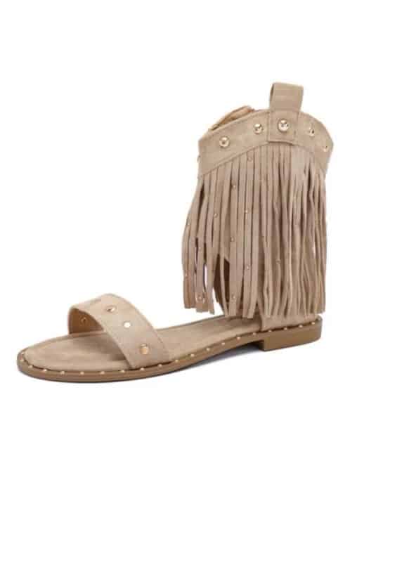 Trendy sandaal van suèdine, heerlijke Ibiza vibe met franjes, de sandaal heeft een ritsje en is afgewerkt met leuke details, erg trendy onder rokken/jurken of een leuke short, en lopen comfy, de sandaal heeft een goudkleurige rits