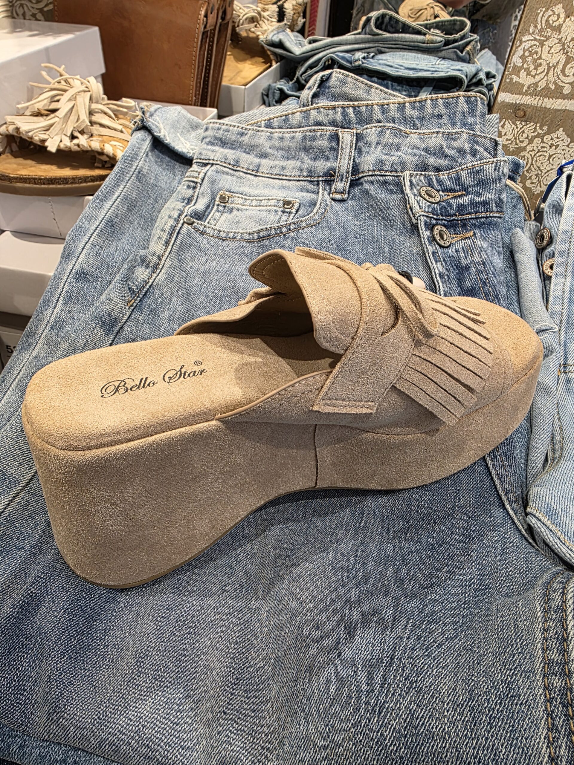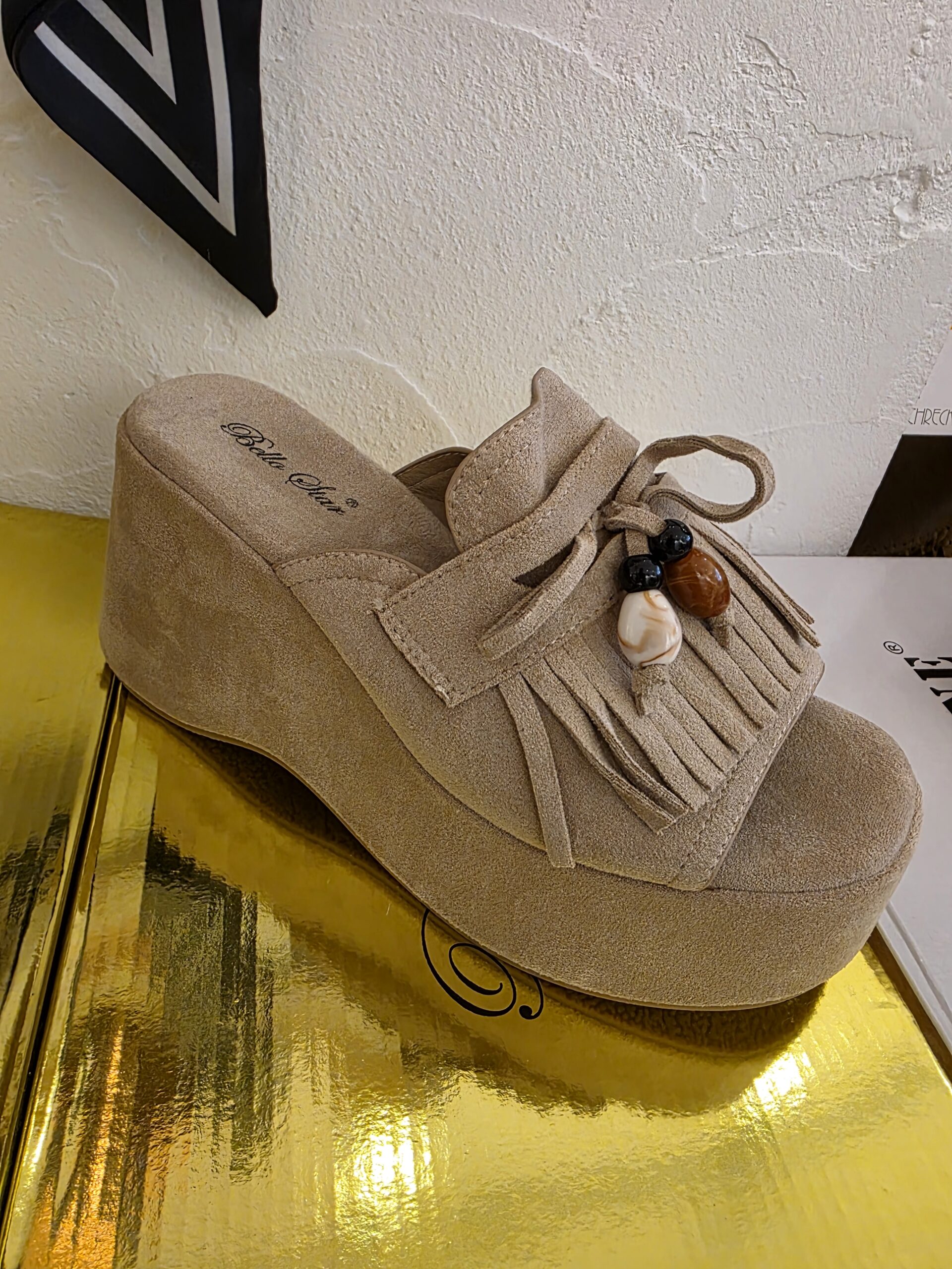 Mooie sleehak sandaal in beige gemaakt van suèdine, deze valt ietsje ruimer, leuk afgewerkt met boho details zoals kraaltjes en franjes.
