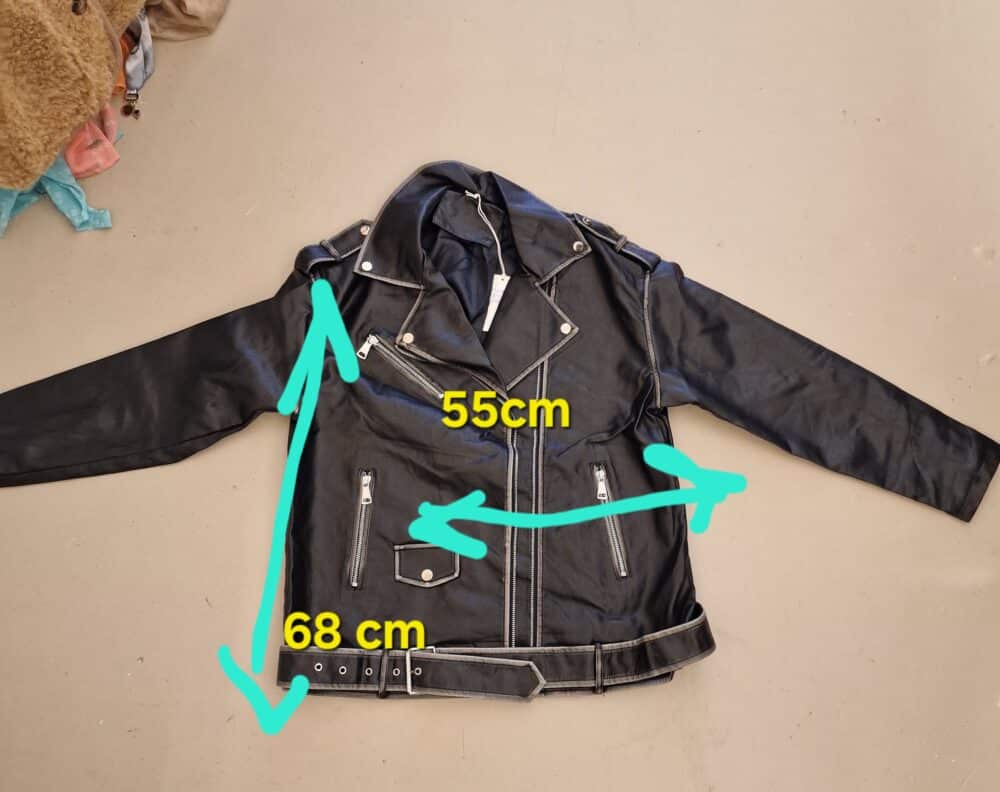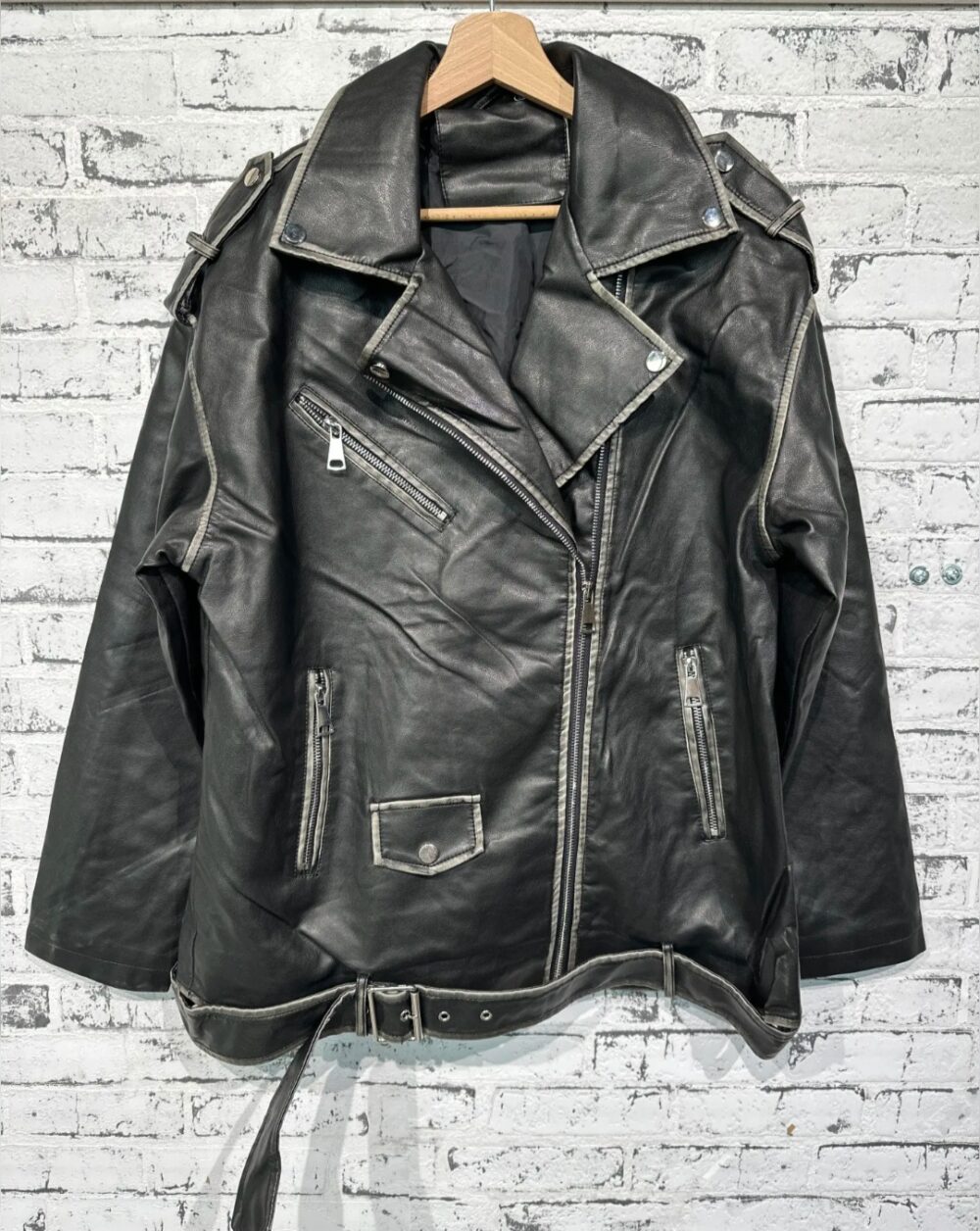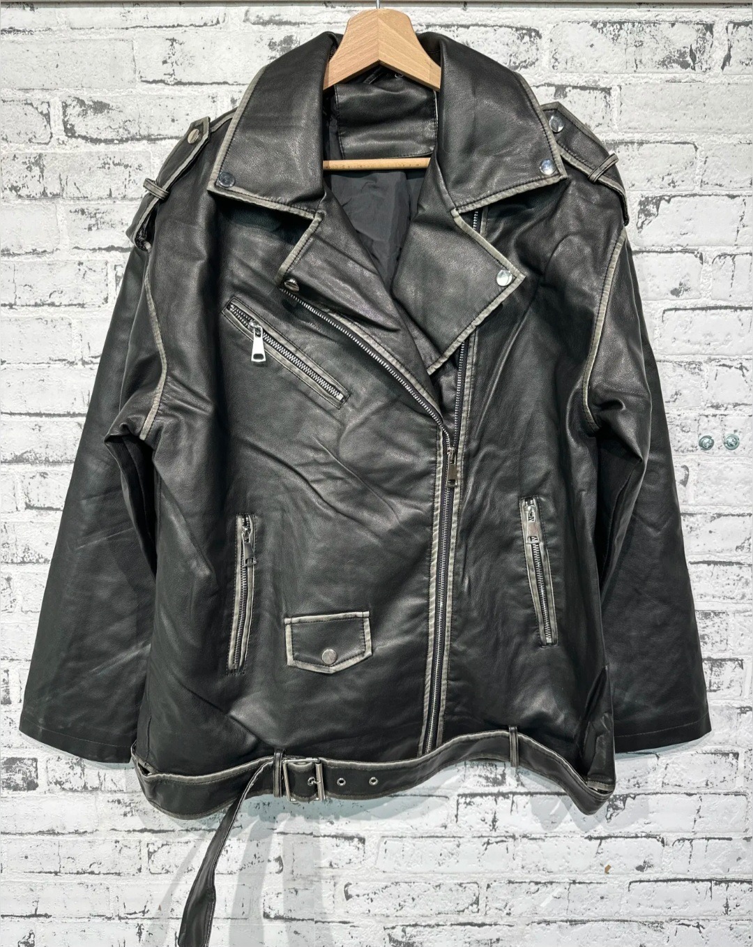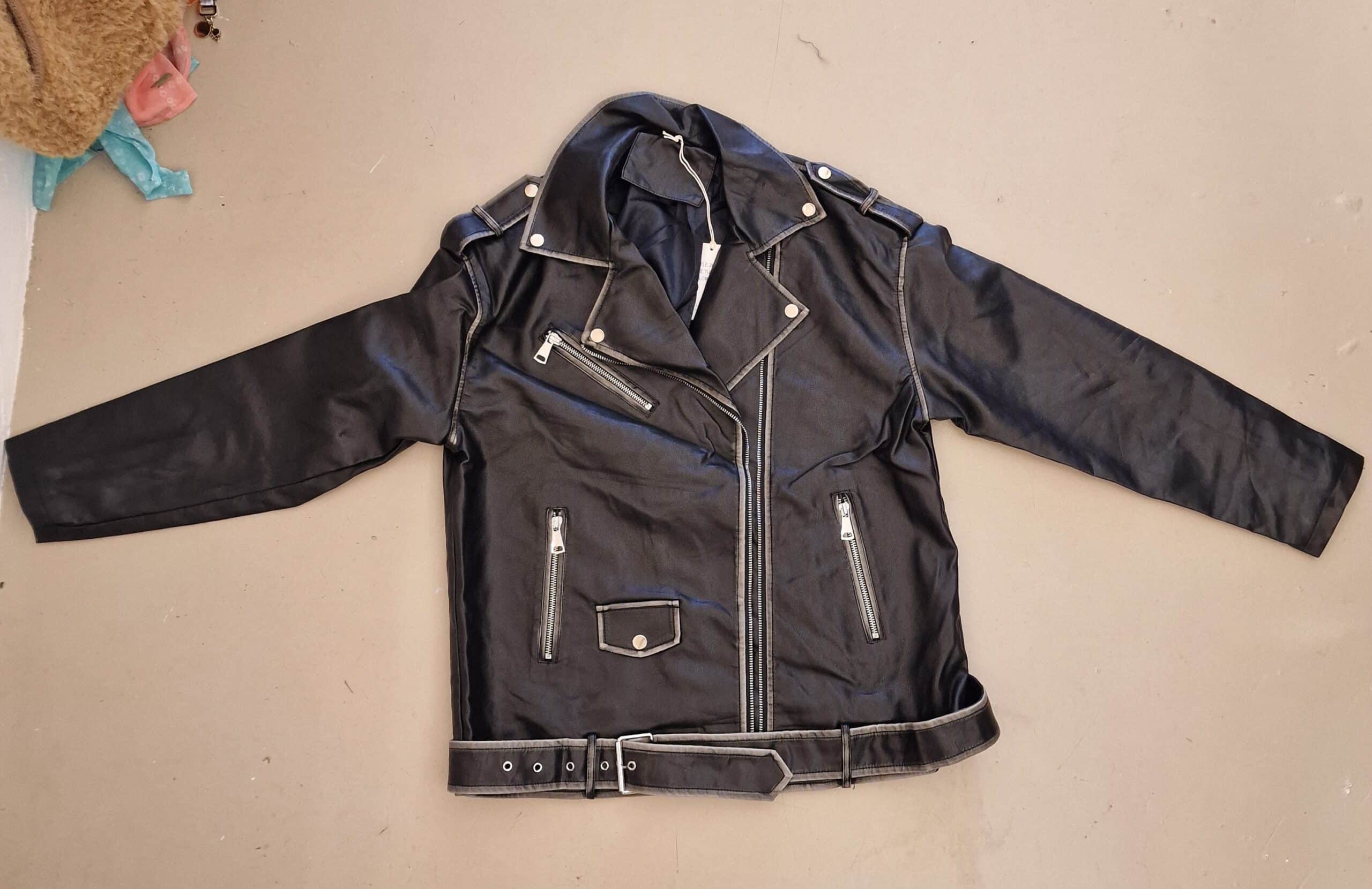 Mooi imitatie leer, stonewashed voor een trendy effect, leuk afgewerkt met zakken en riempjes, één maat, past tot zeker 42, model op de foto is een maat 44, draagt hem open, super gave jas.