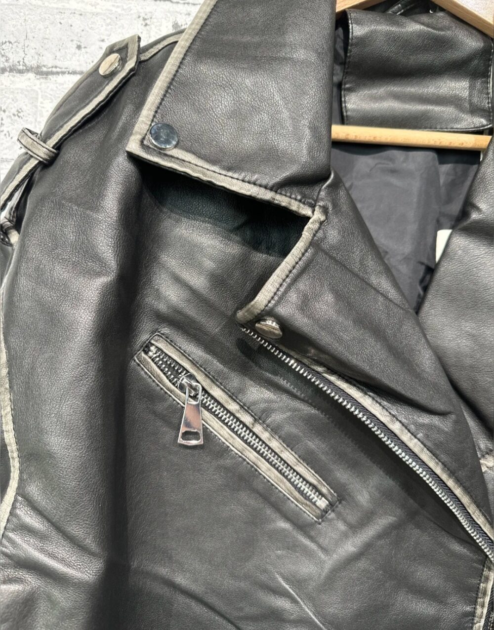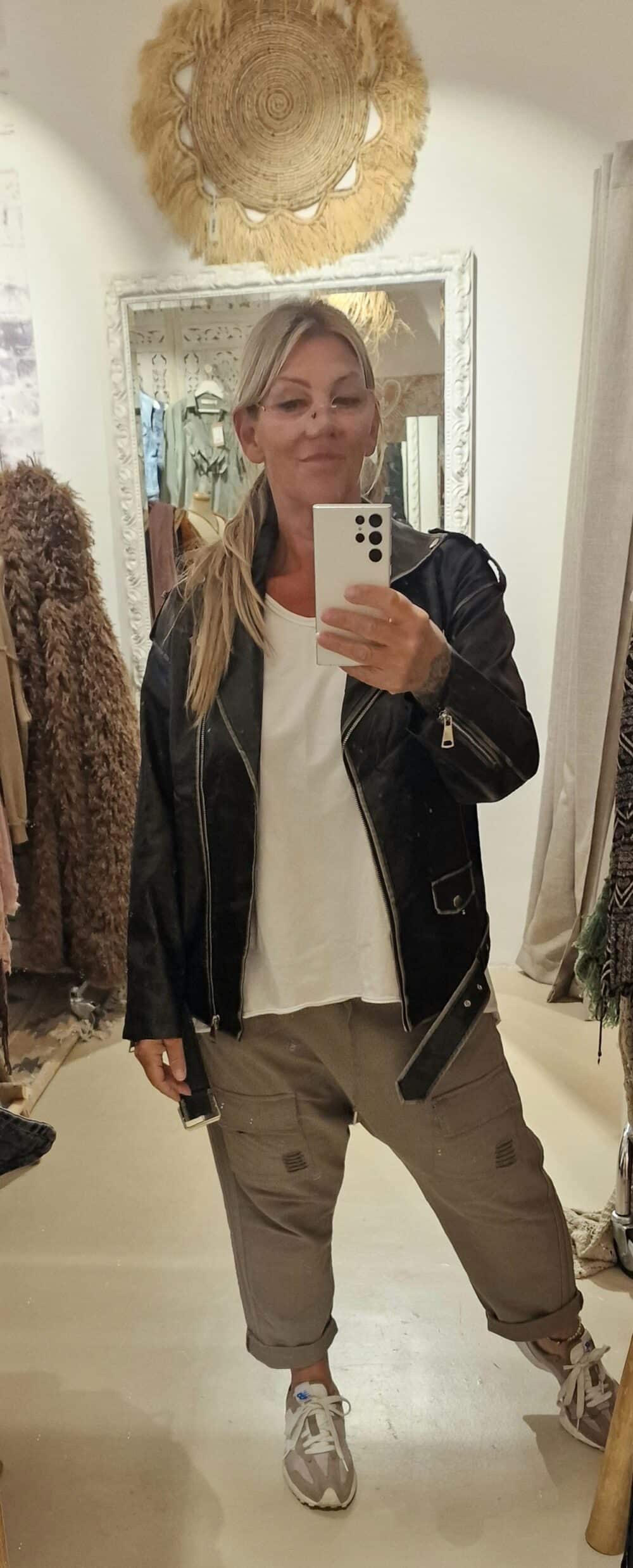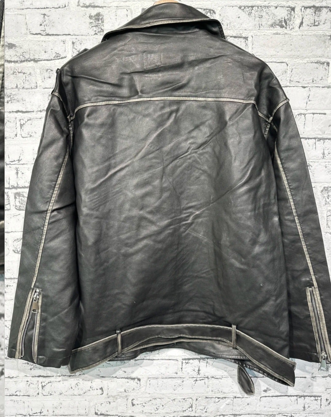 Mooi imitatie leer, stonewashed voor een trendy effect, leuk afgewerkt met zakken en riempjes, één maat, past tot zeker 42, model op de foto is een maat 44, draagt hem open, super gave jas.