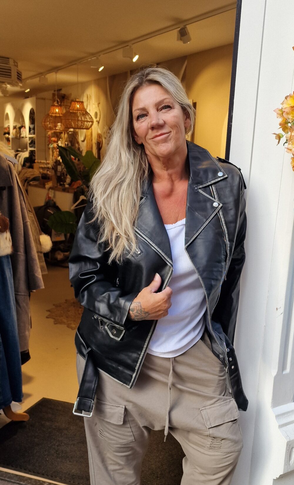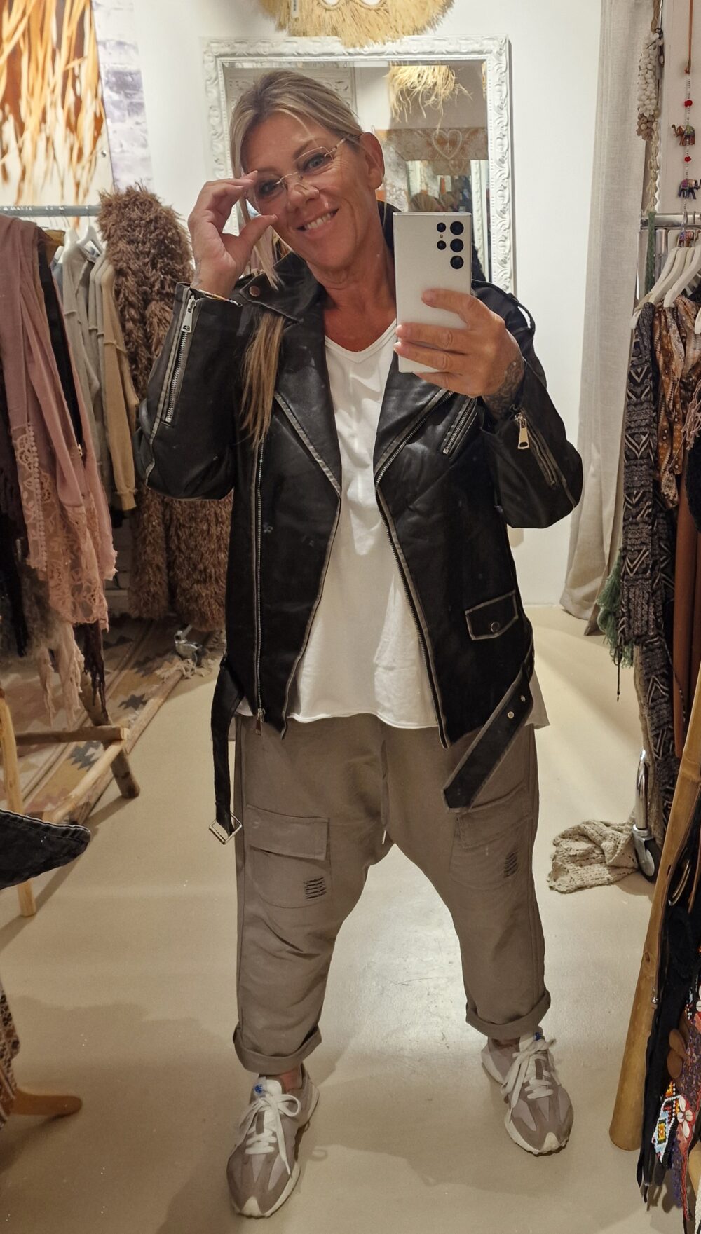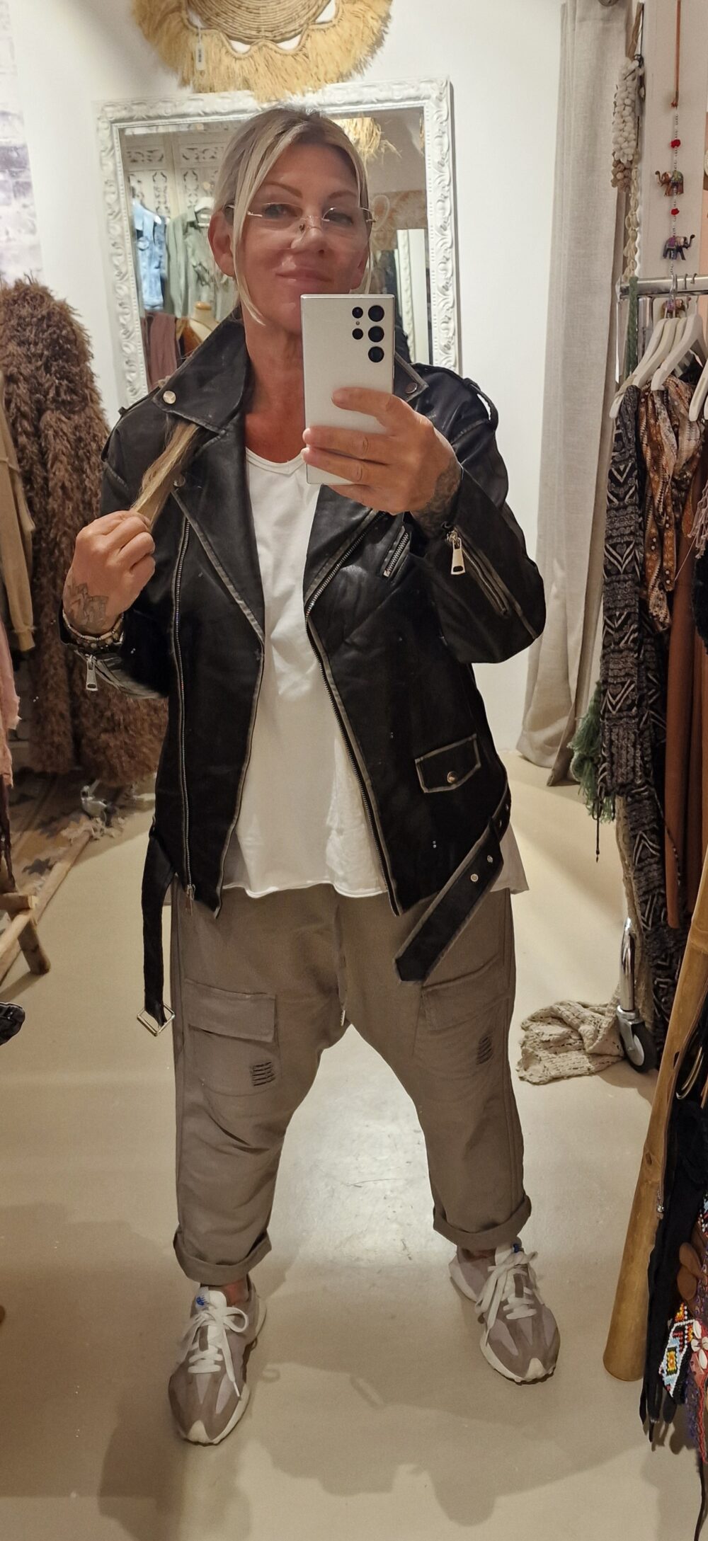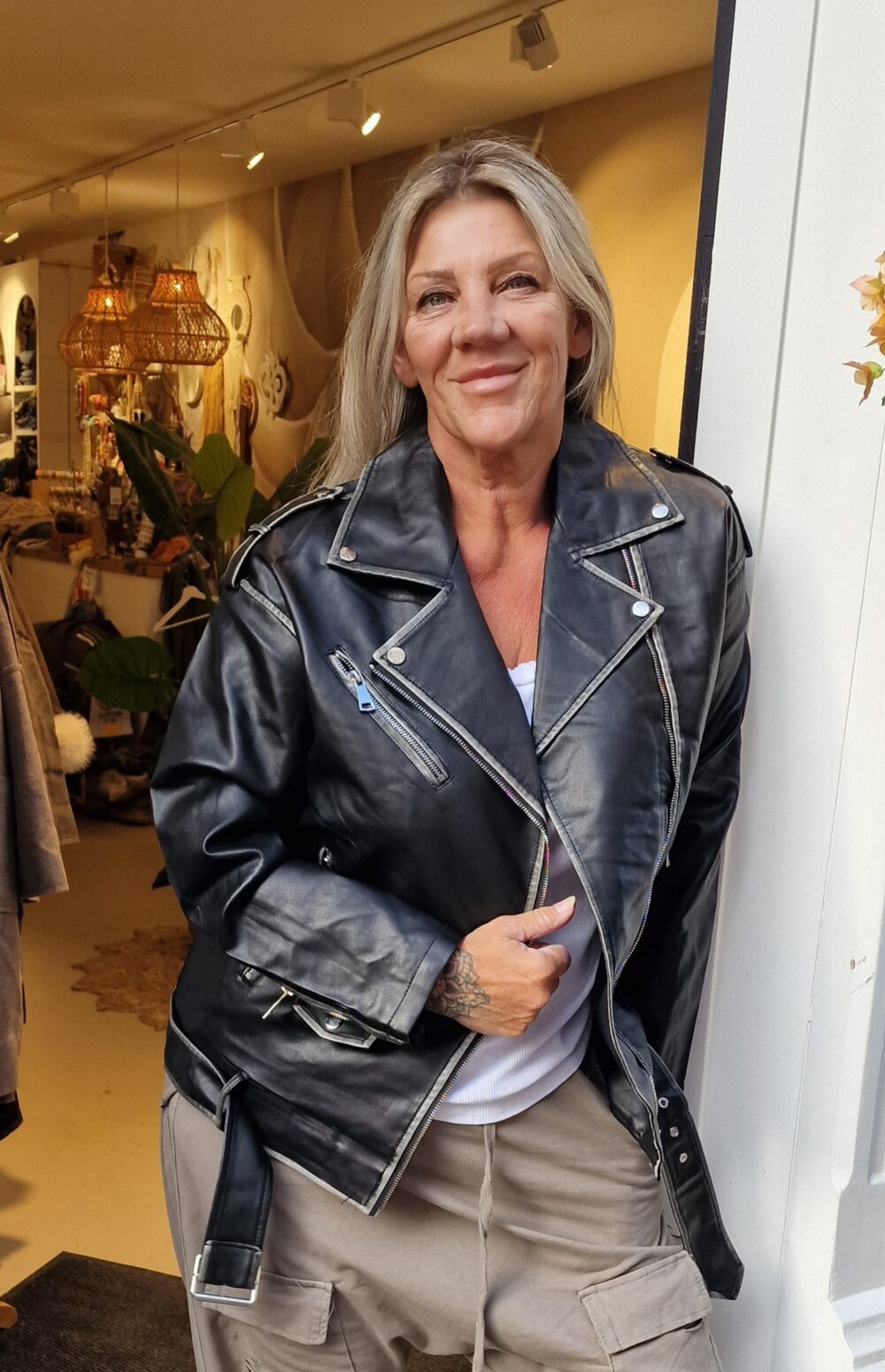Mooi imitatie leer, stonewashed voor een trendy effect, leuk afgewerkt met zakken en riempjes, één maat, past tot zeker 42, model op de foto is een maat 44, draagt hem open, super gave jas.