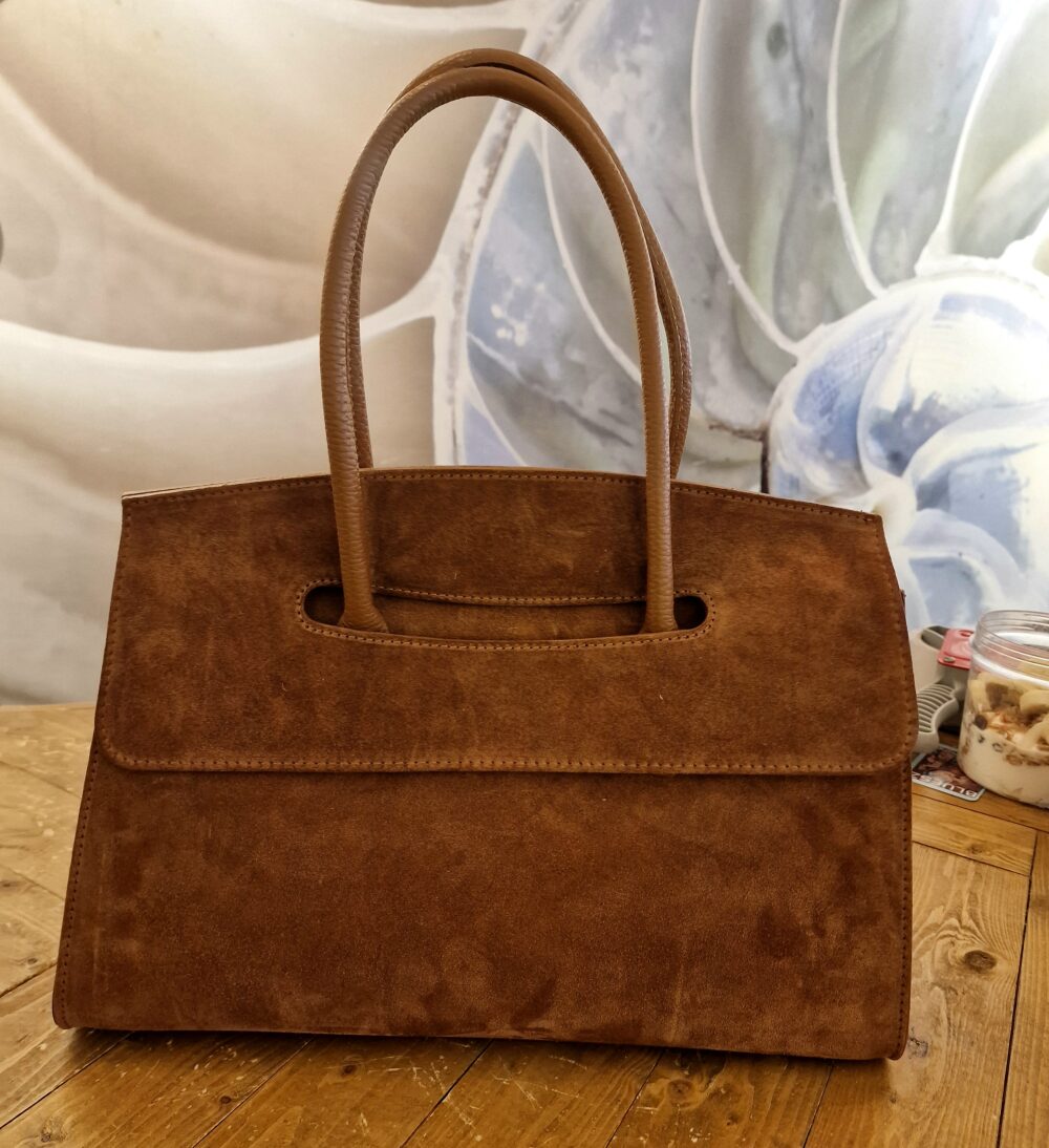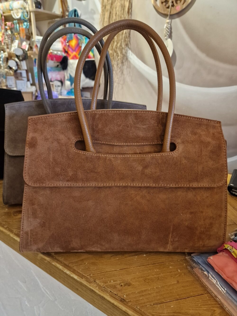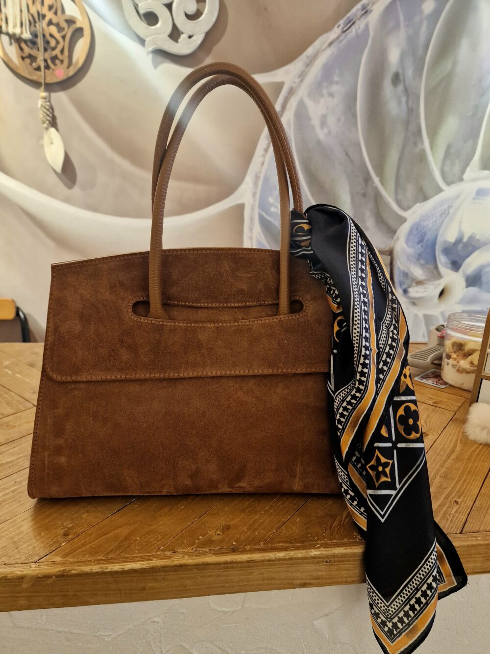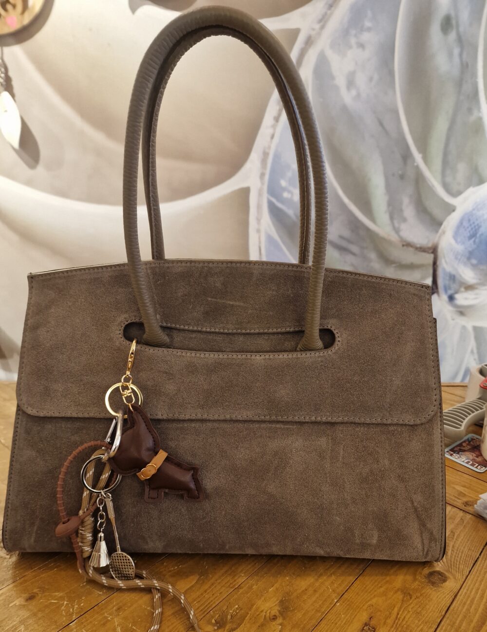 mooie tas van echt suedé, mooi strak model, het hengsel gaat door de opening vóór, de tas heeft ook een lange band, een echte topper, exclusief hanger/sjaal….wel een leuke tip om je tas extra te stylen!