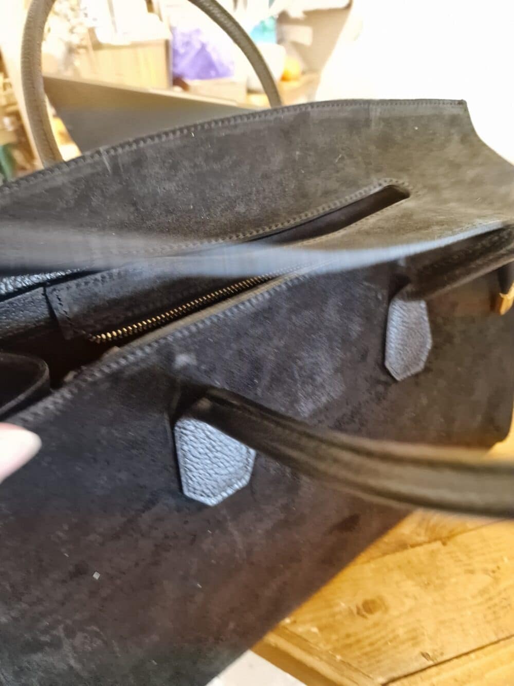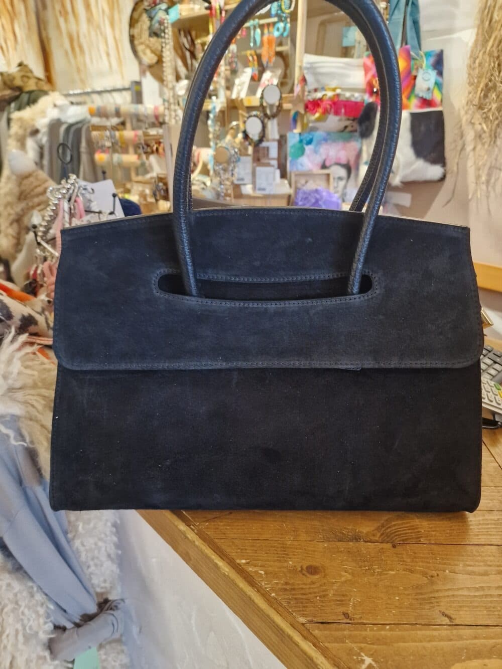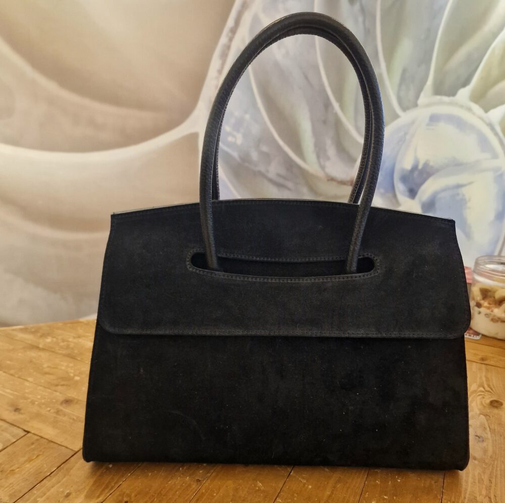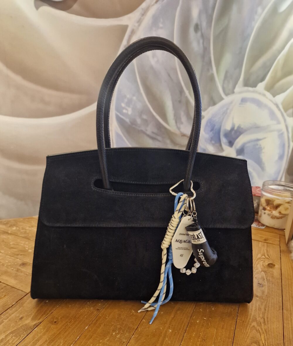 mooie tas van echt suedé, mooi strak model, het hengsel gaat door de opening vóór, de tas heeft ook een lange band, een echte topper, exclusief hanger/sjaal….wel een leuke tip om je tas extra te stylen!