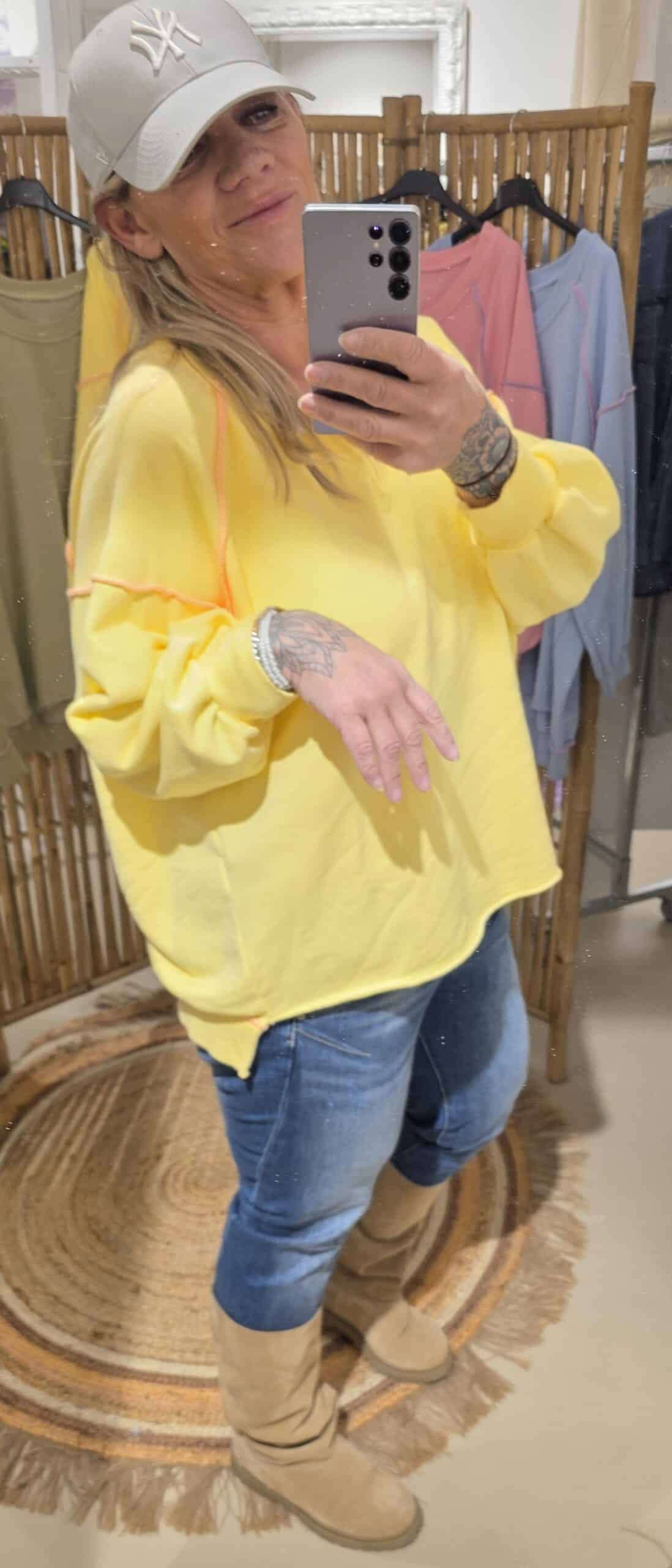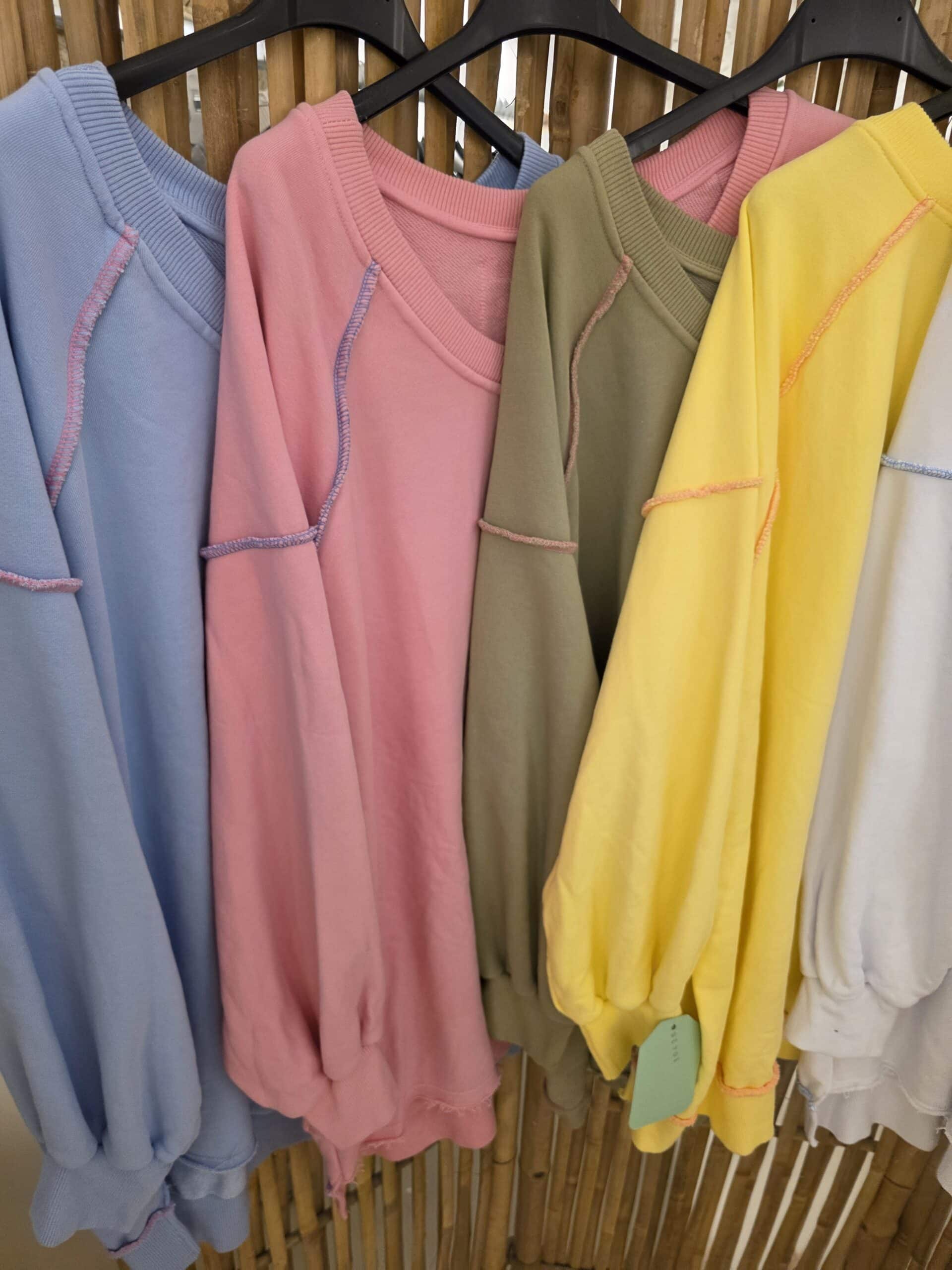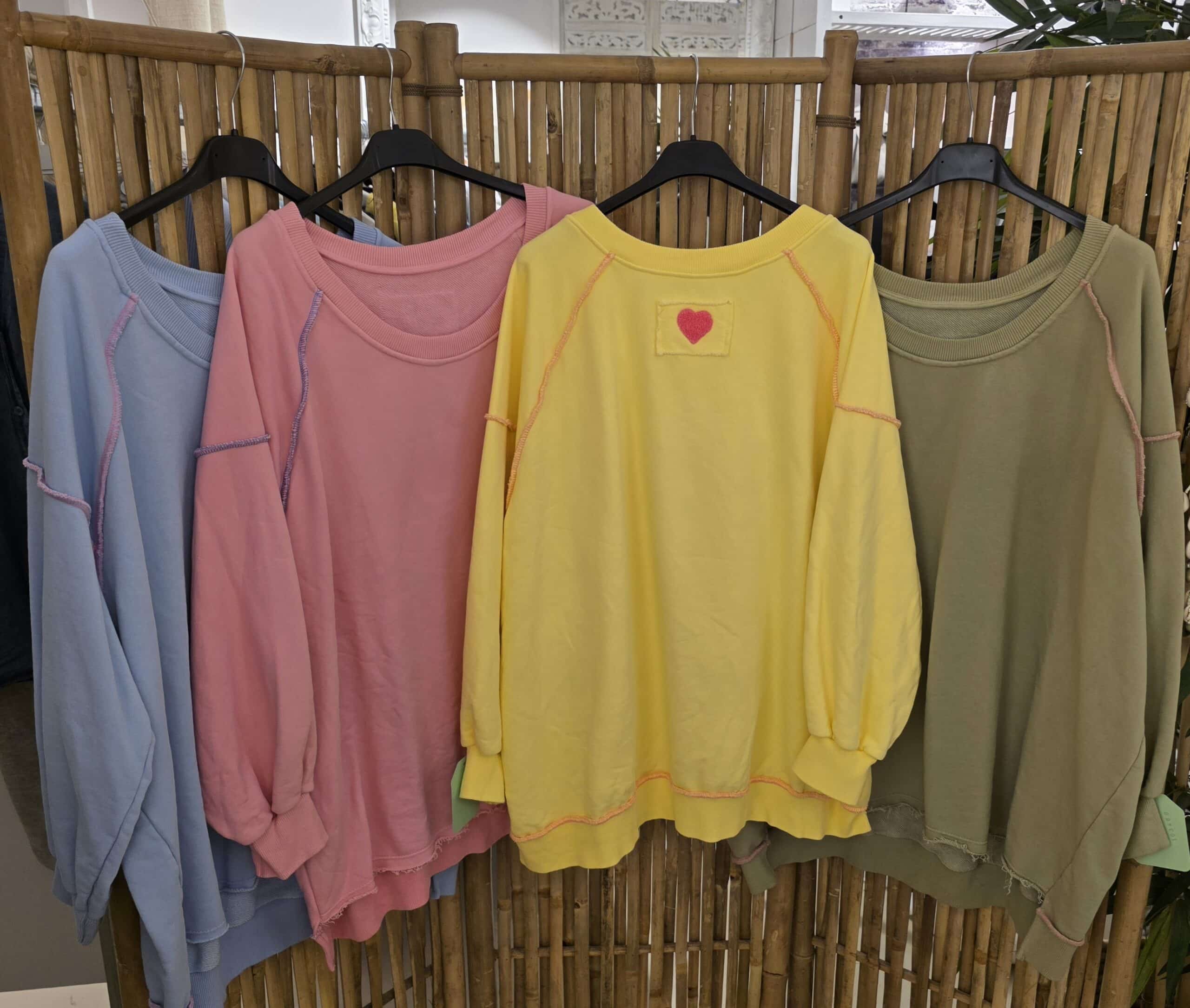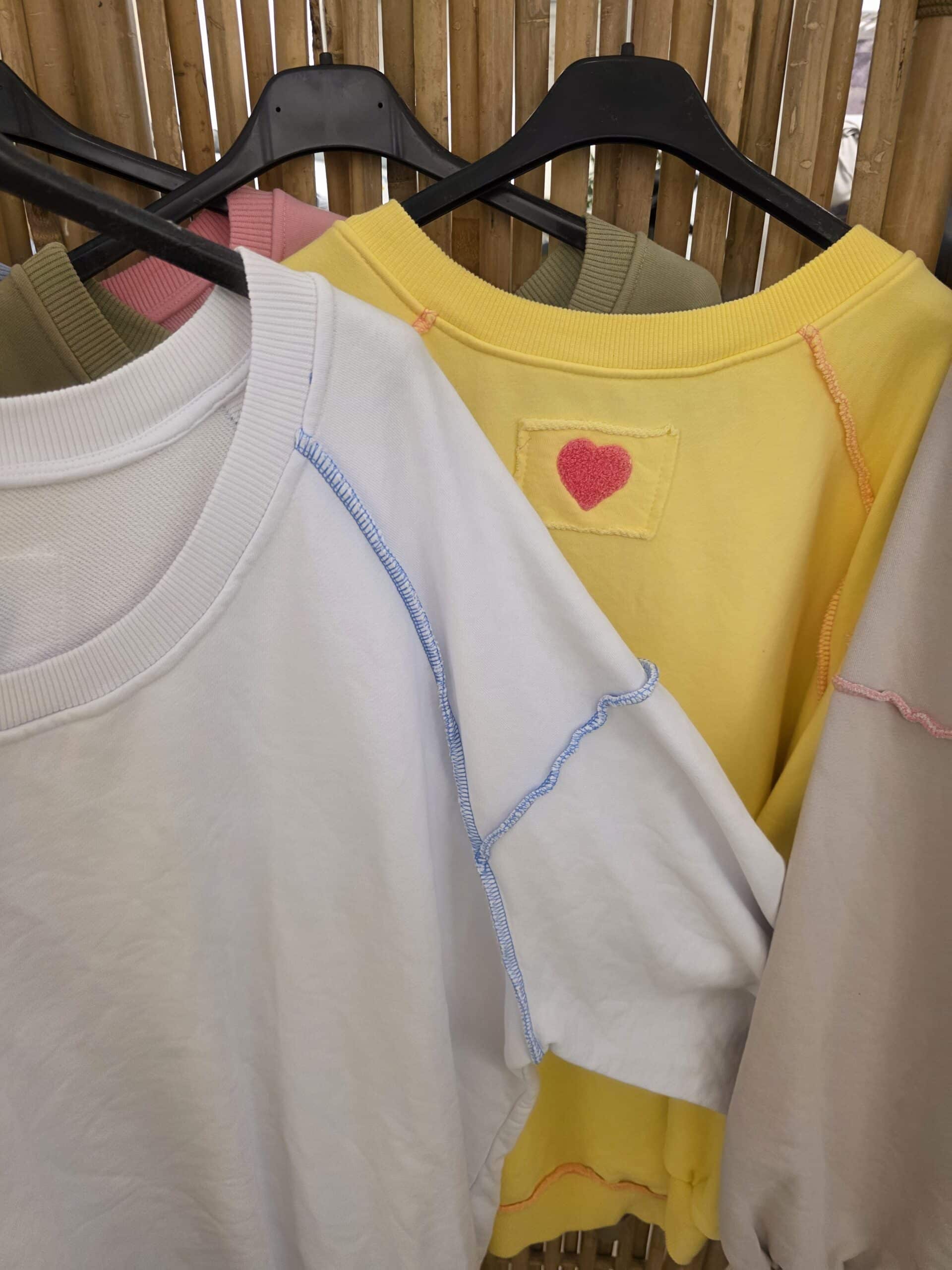 Leuke oversized sweater met contrasterende naden, achter op de sweater zit een leuk hartje bij de nek, de sweater is geheel natuurlijk materiaal en is één maat, valt goed oversized.