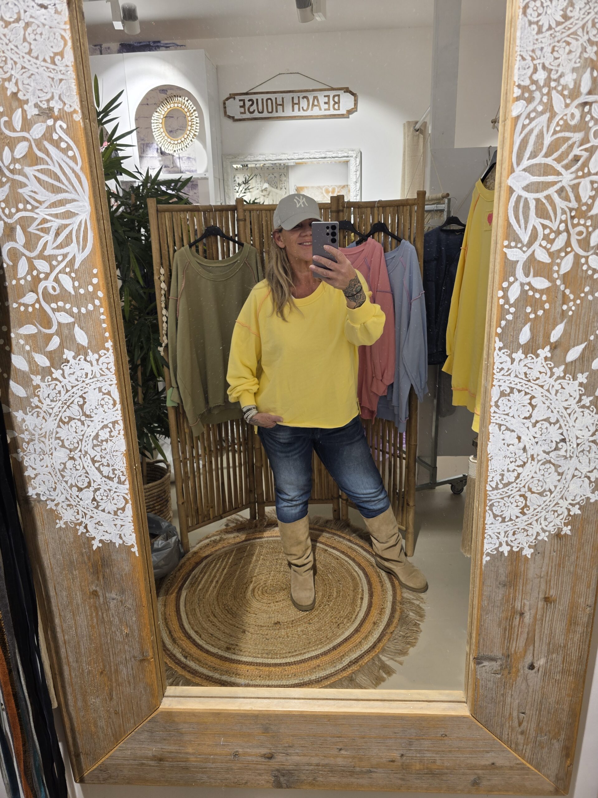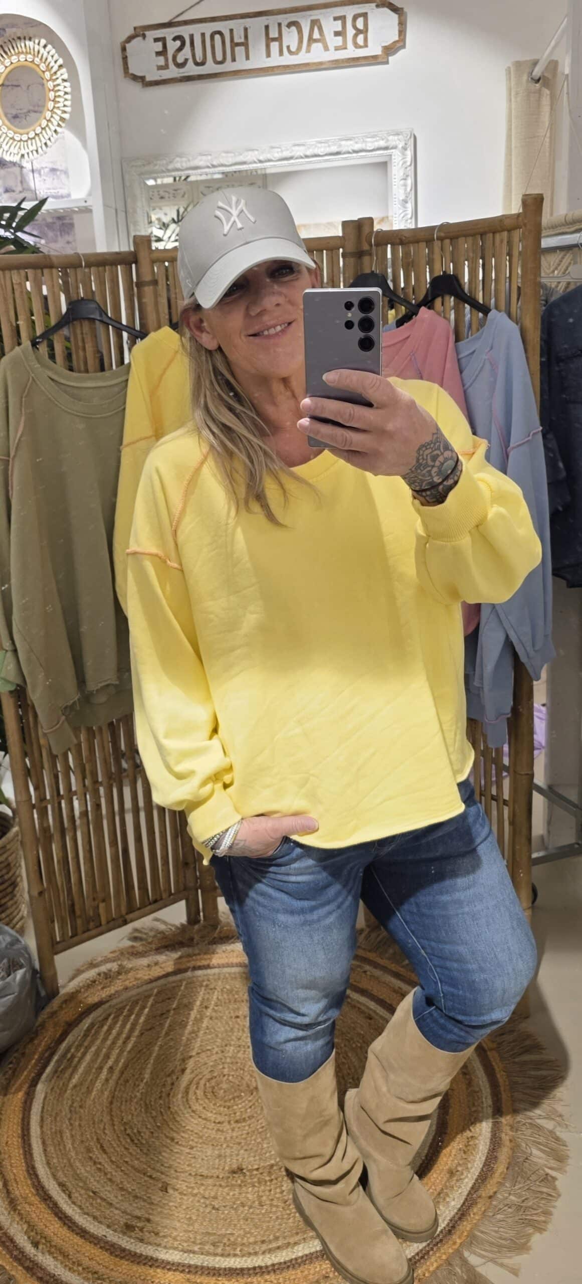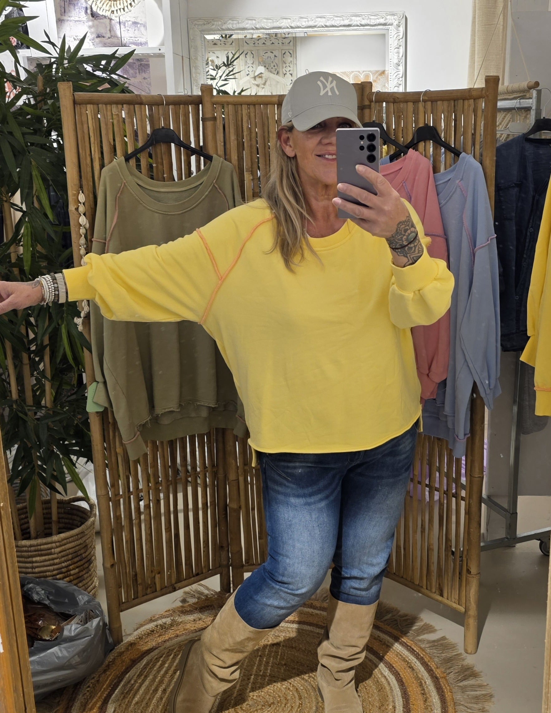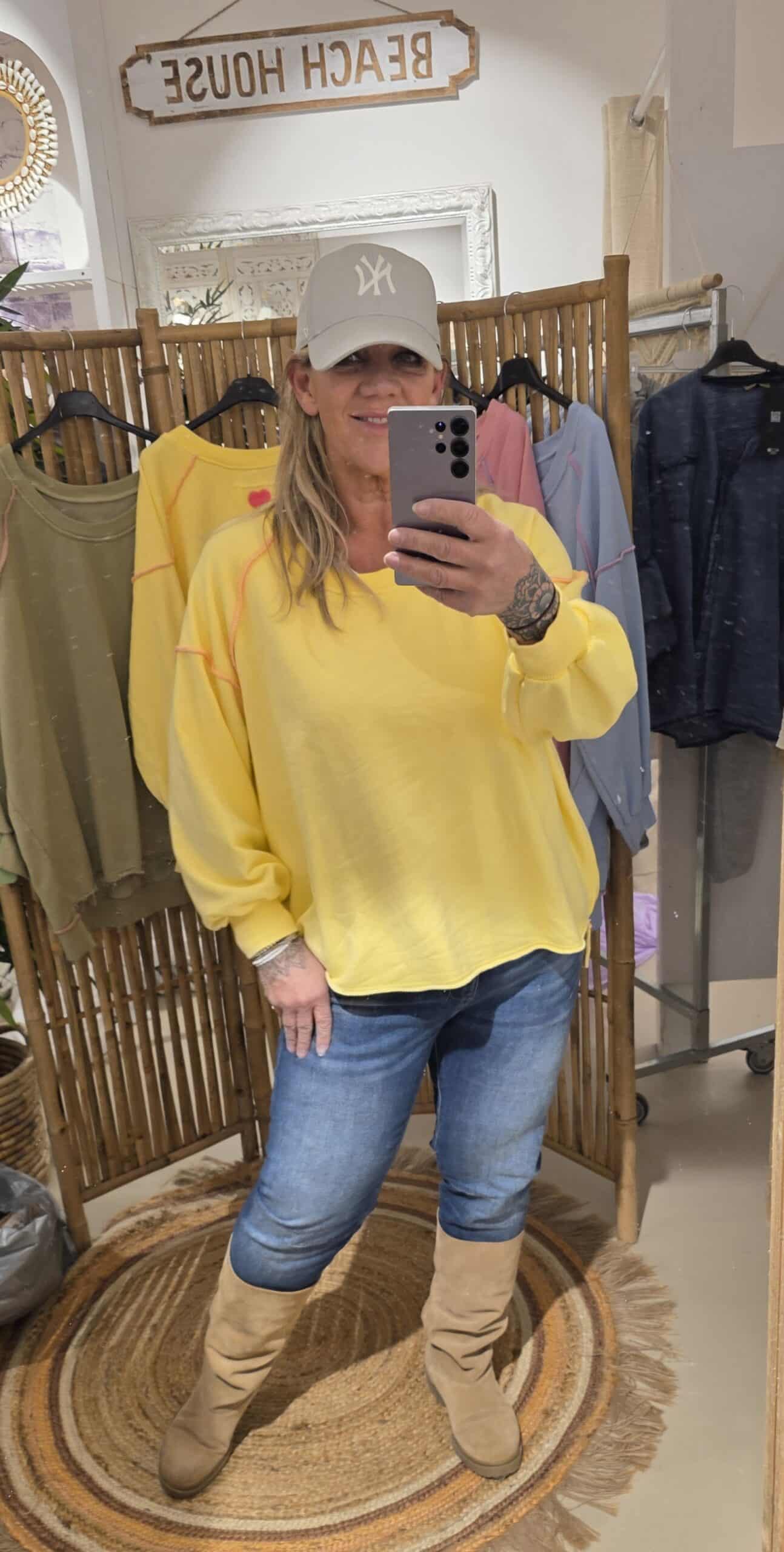 Leuke oversized sweater met contrasterende naden, achter op de sweater zit een leuk hartje bij de nek, de sweater is geheel natuurlijk materiaal en is één maat, valt goed oversized.