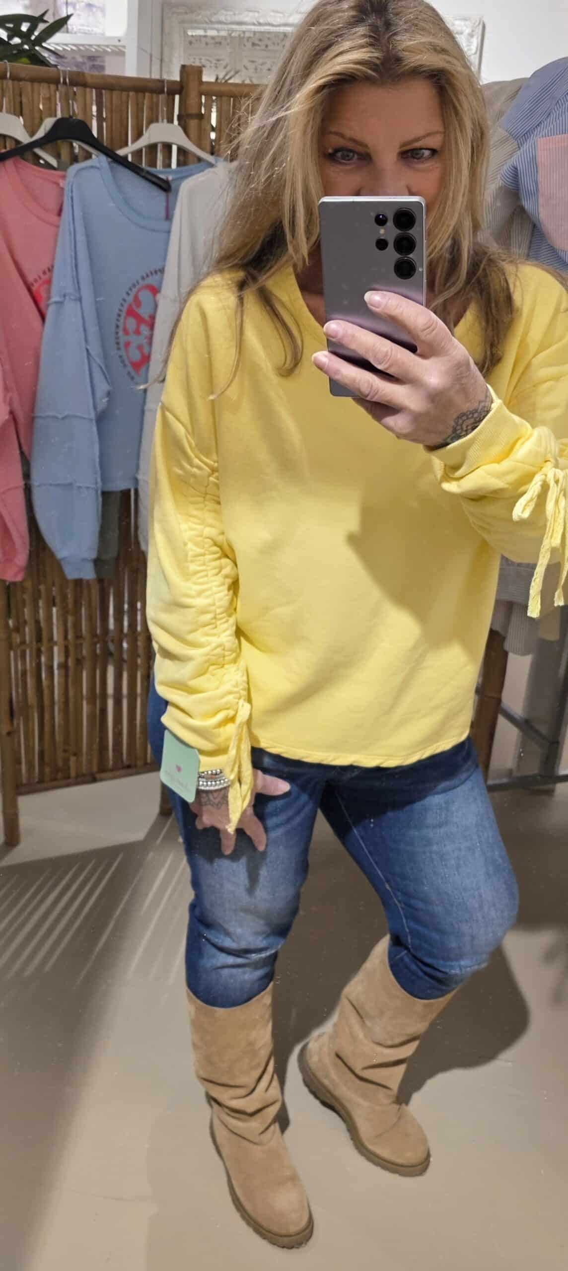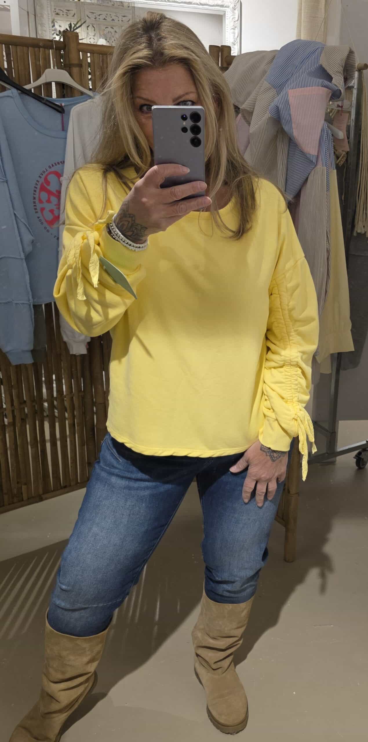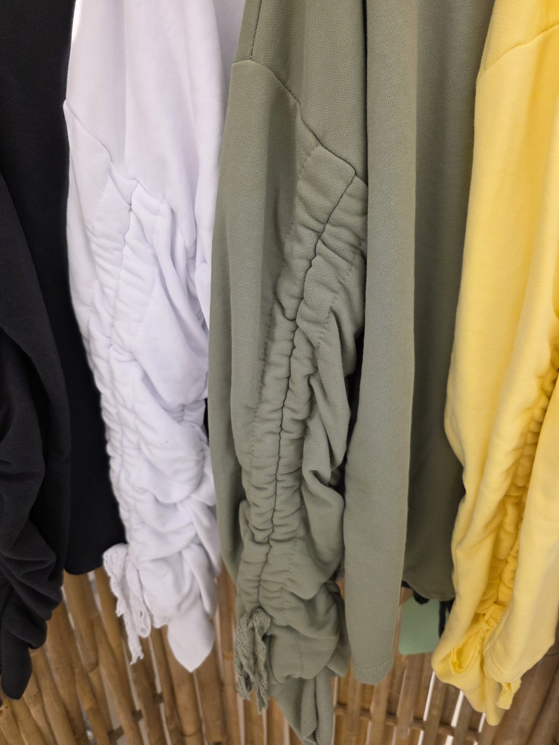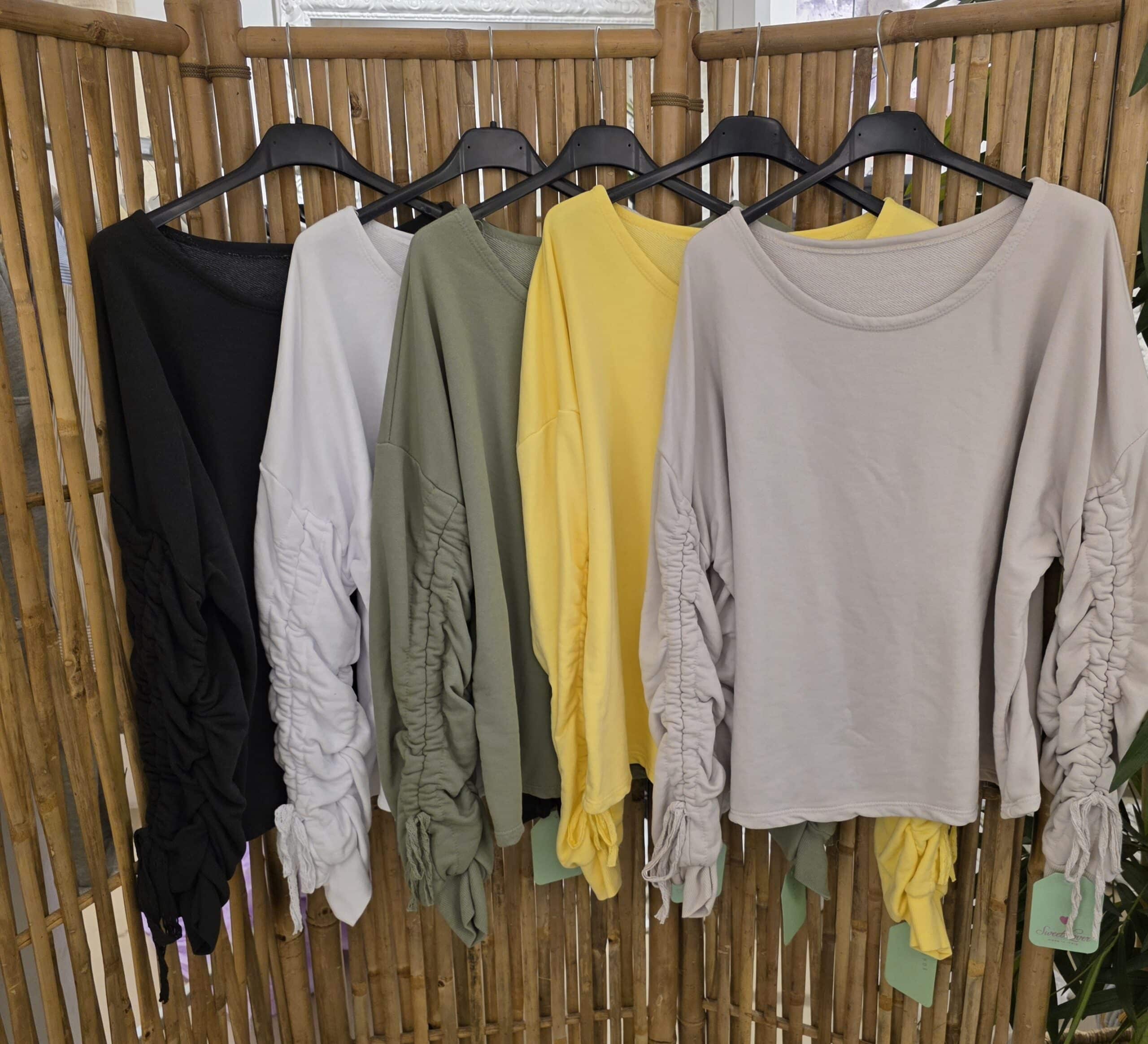 Geheel natuurlijk materiaal deze leuke korte sweaters, de mouwen zijn gerimpeld met een sweater koord, één maat