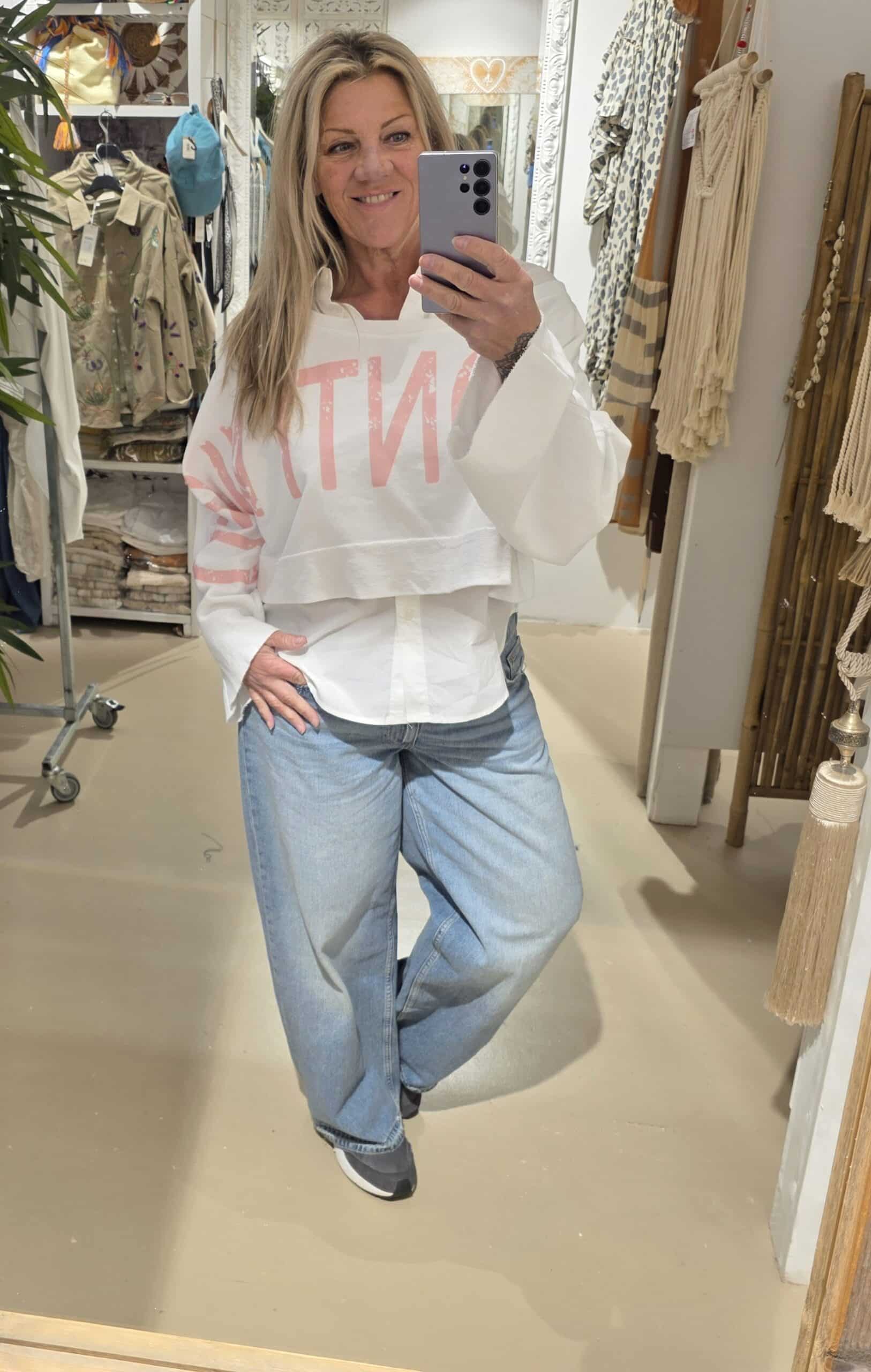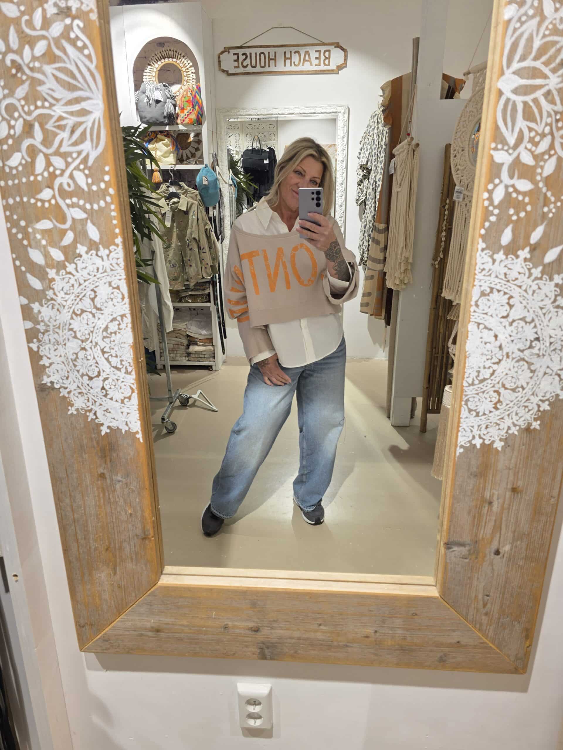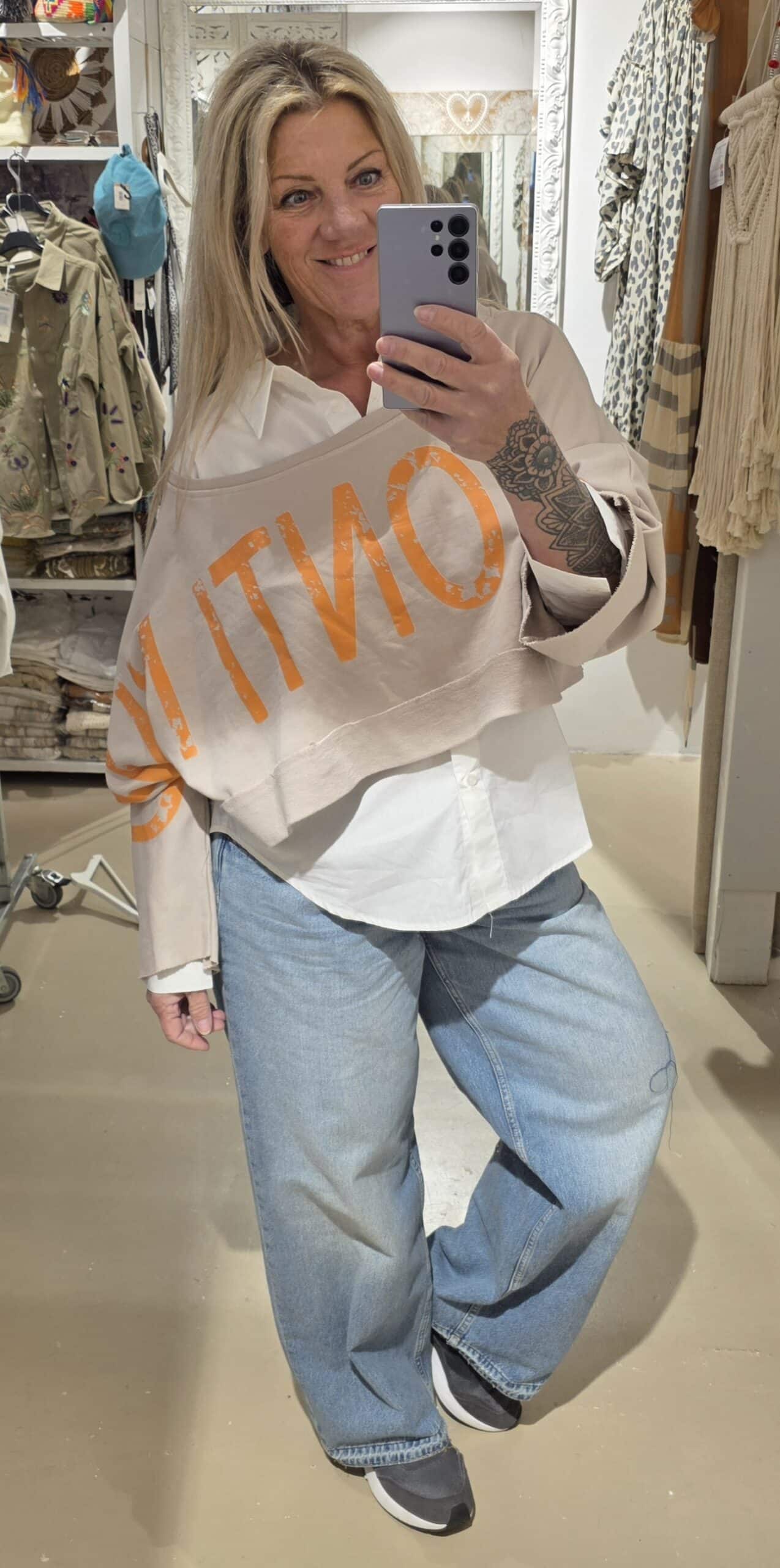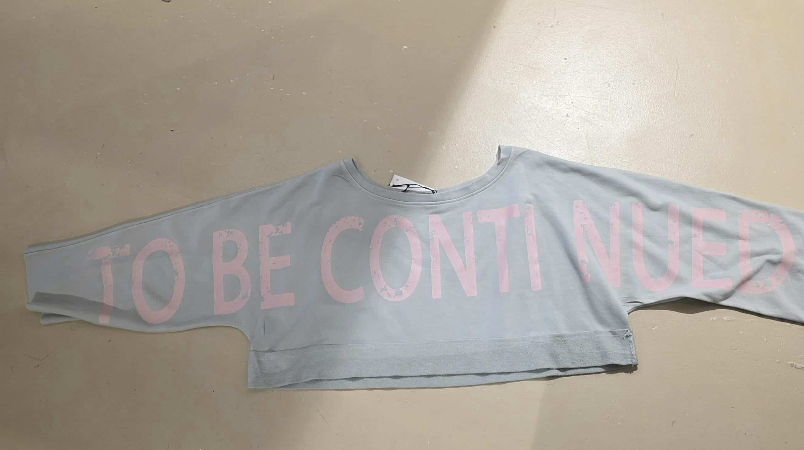 Trendy sweater in kort model, leuk over een blouse of ander shirt, lange mouw met mooie tekst van mouw tot mouw, to be continued , in natuurlijk materiaal, één maat, off shoulder model