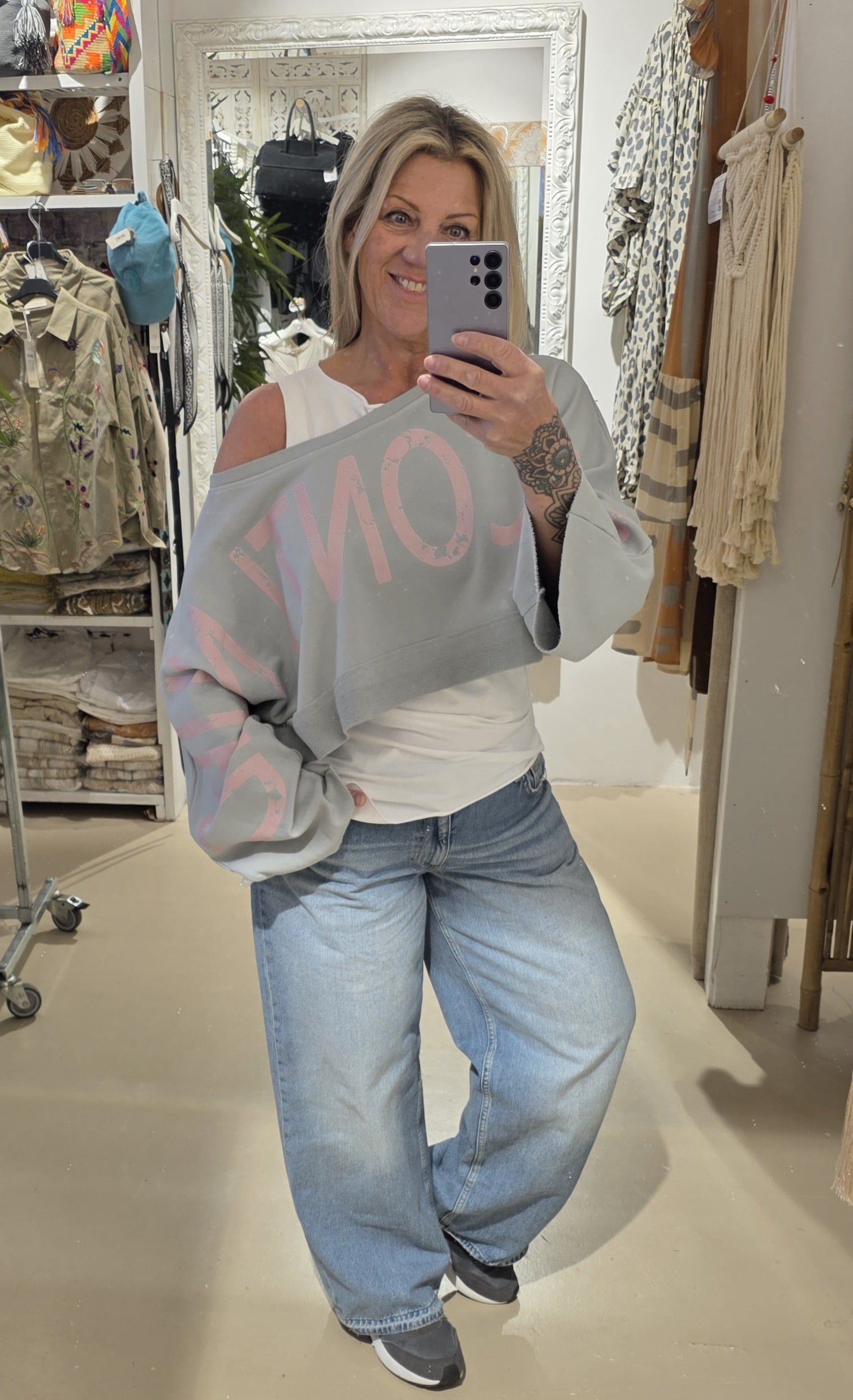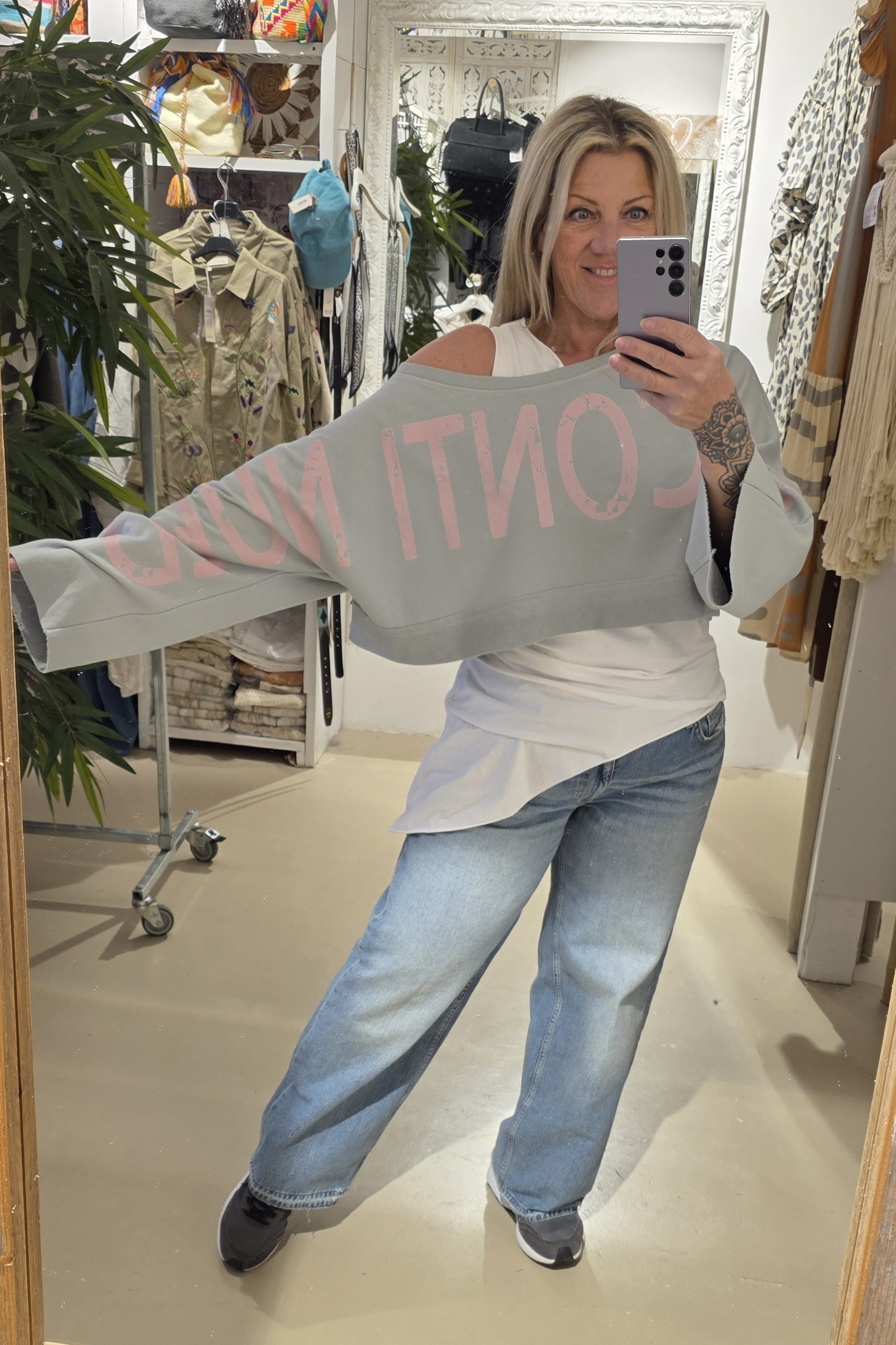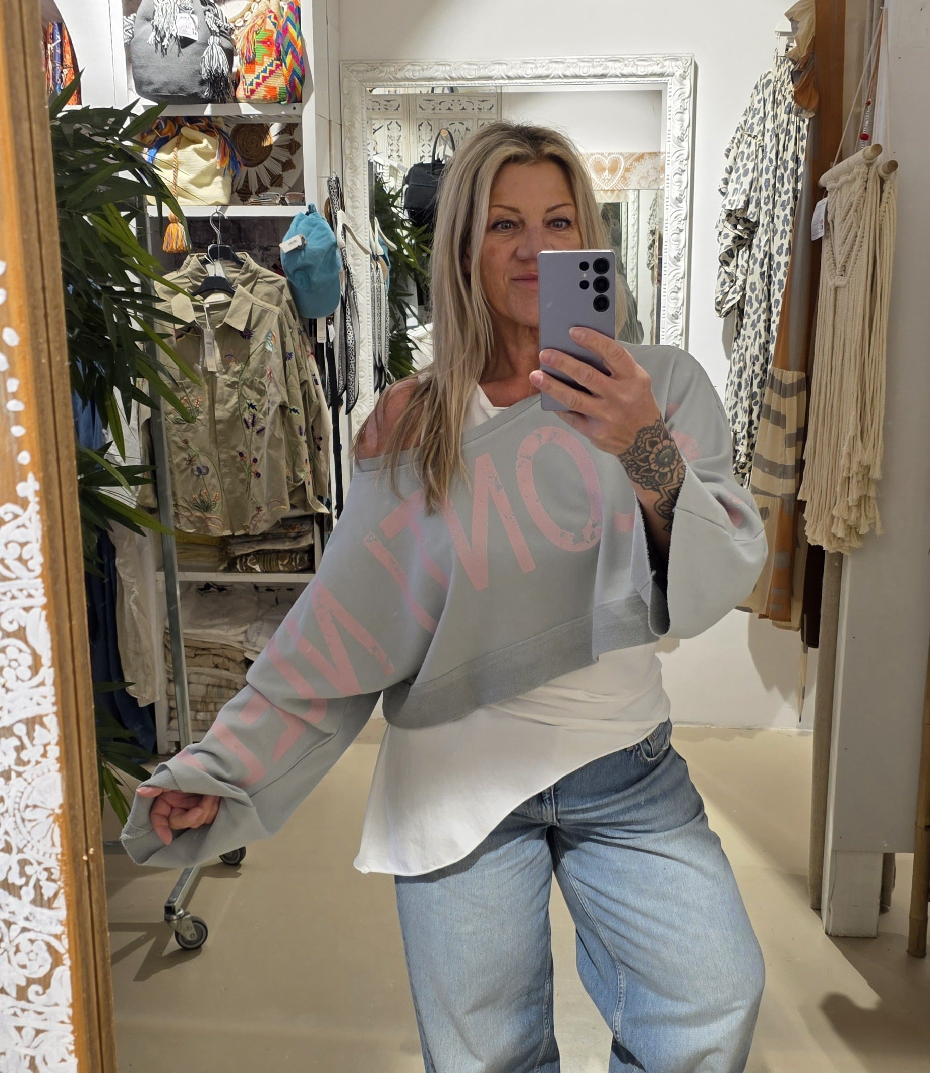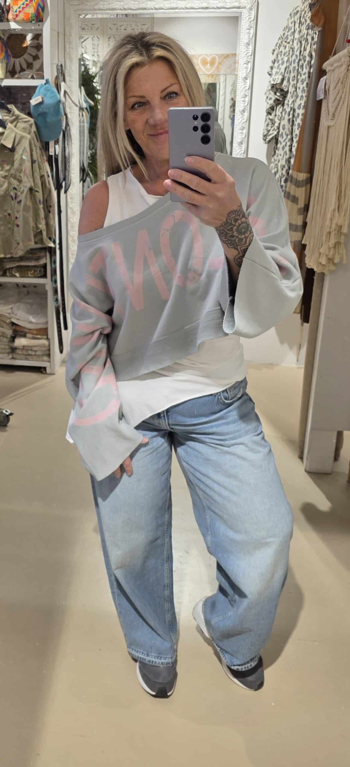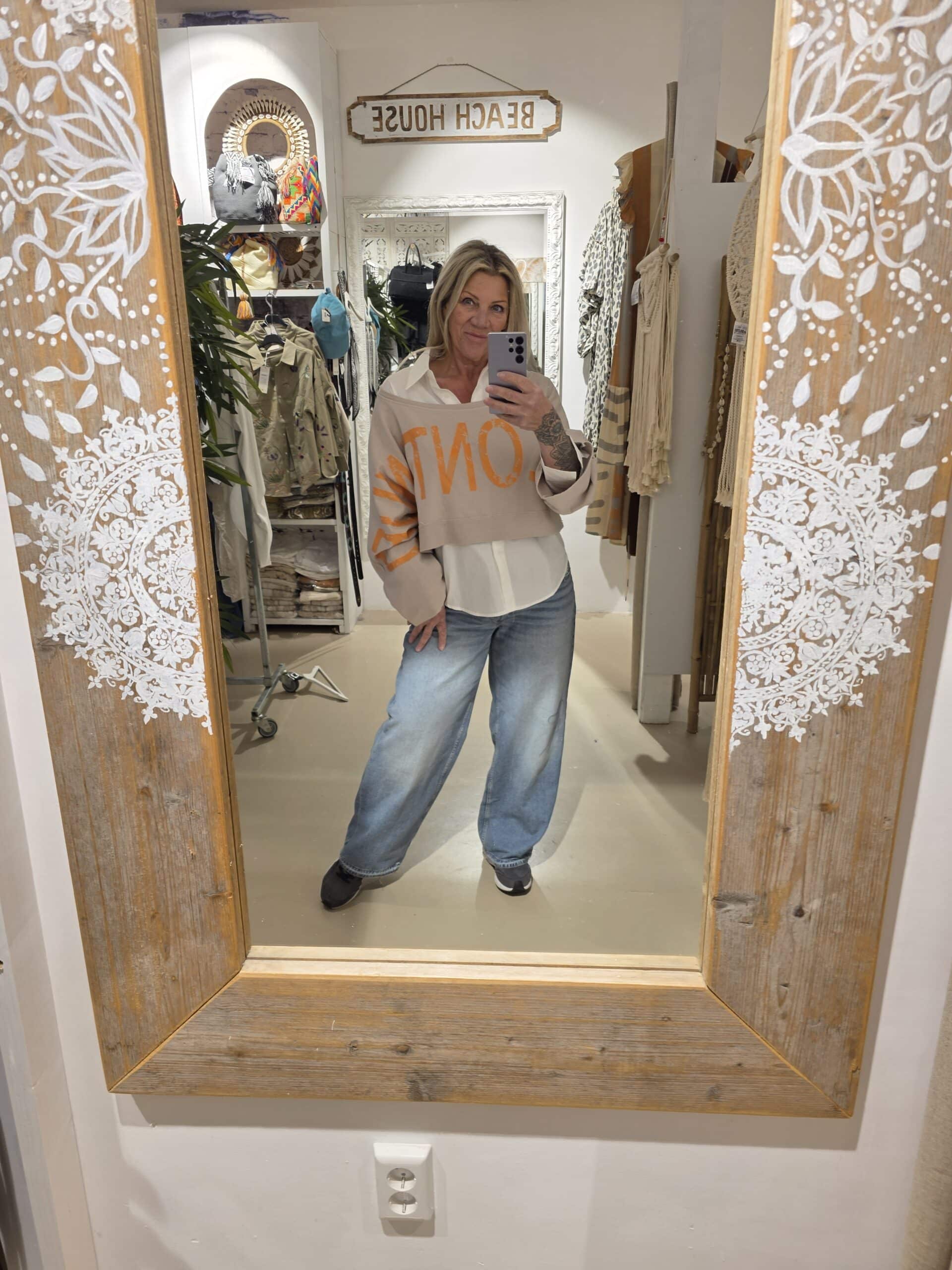 Trendy sweater in kort model, leuk over een blouse of ander shirt, lange mouw met mooie tekst van mouw tot mouw, to be continued , in natuurlijk materiaal, één maat, off shoulder model