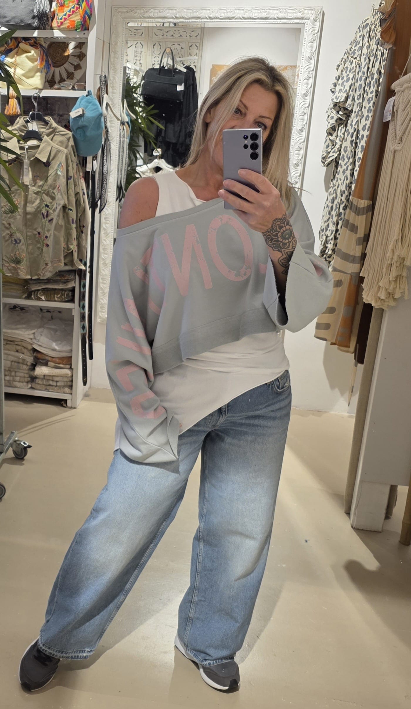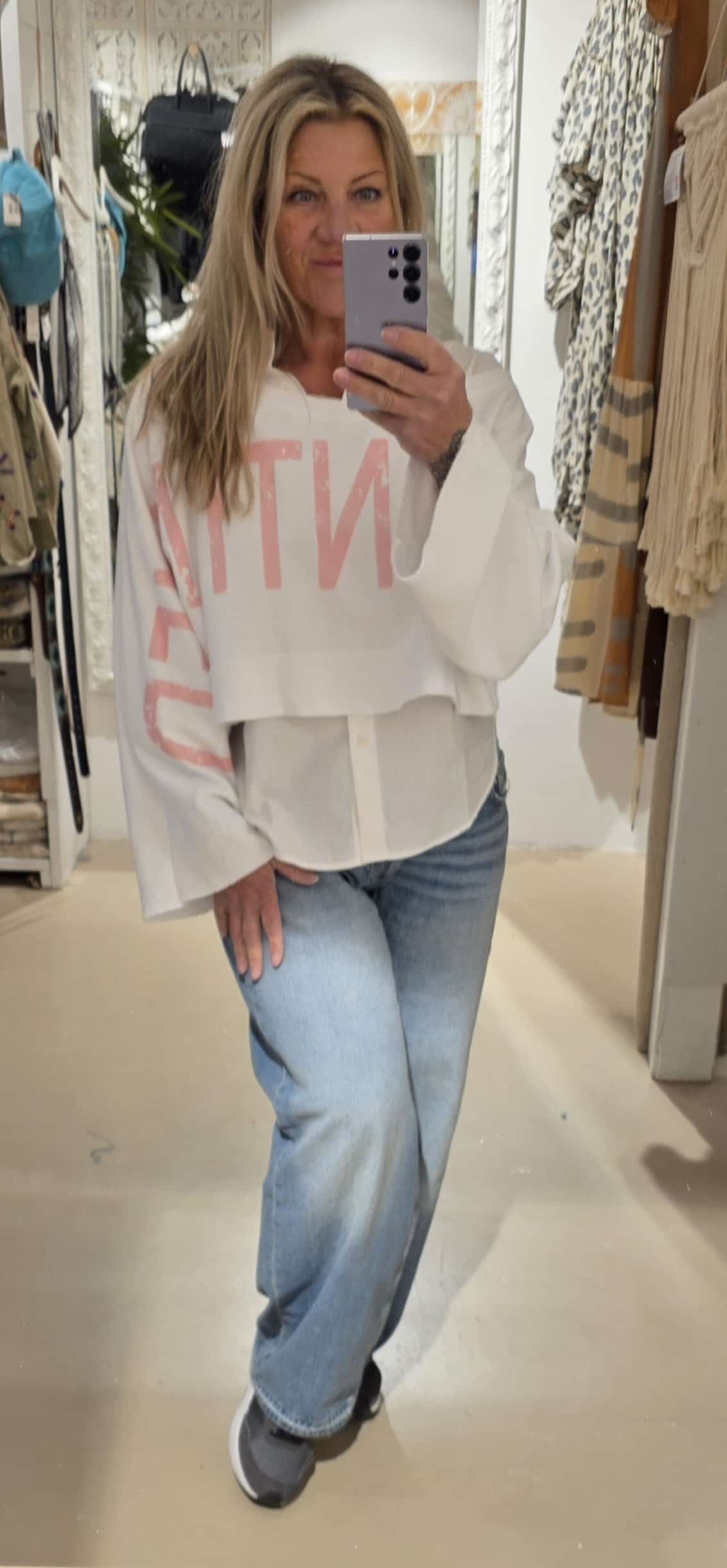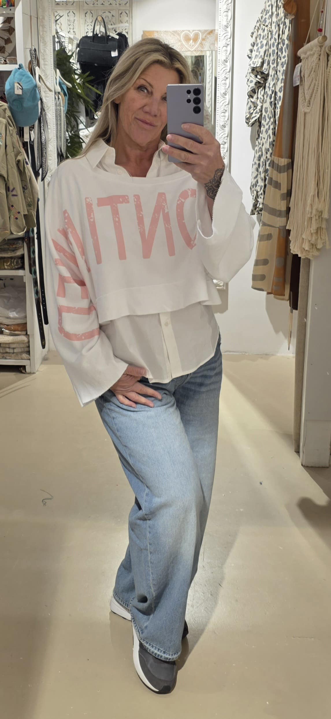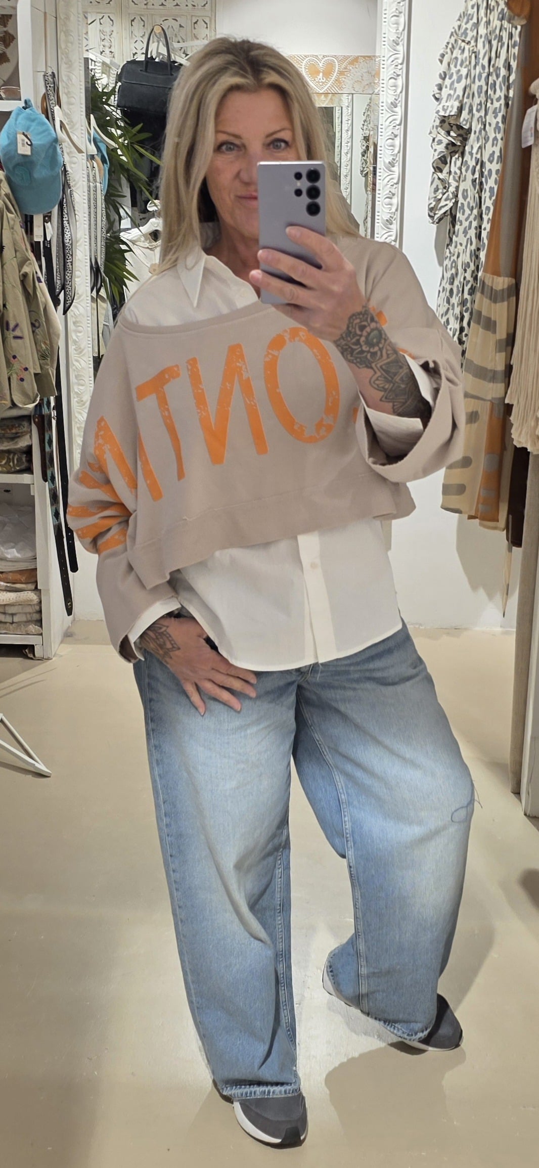 Trendy sweater in kort model, leuk over een blouse of ander shirt, lange mouw met mooie tekst van mouw tot mouw, to be continued , in natuurlijk materiaal, één maat, off shoulder model