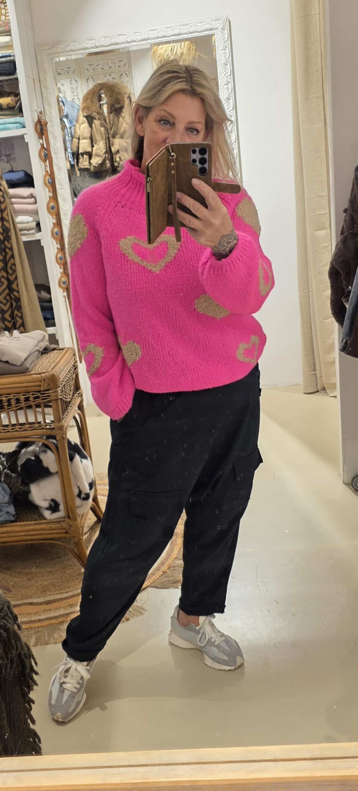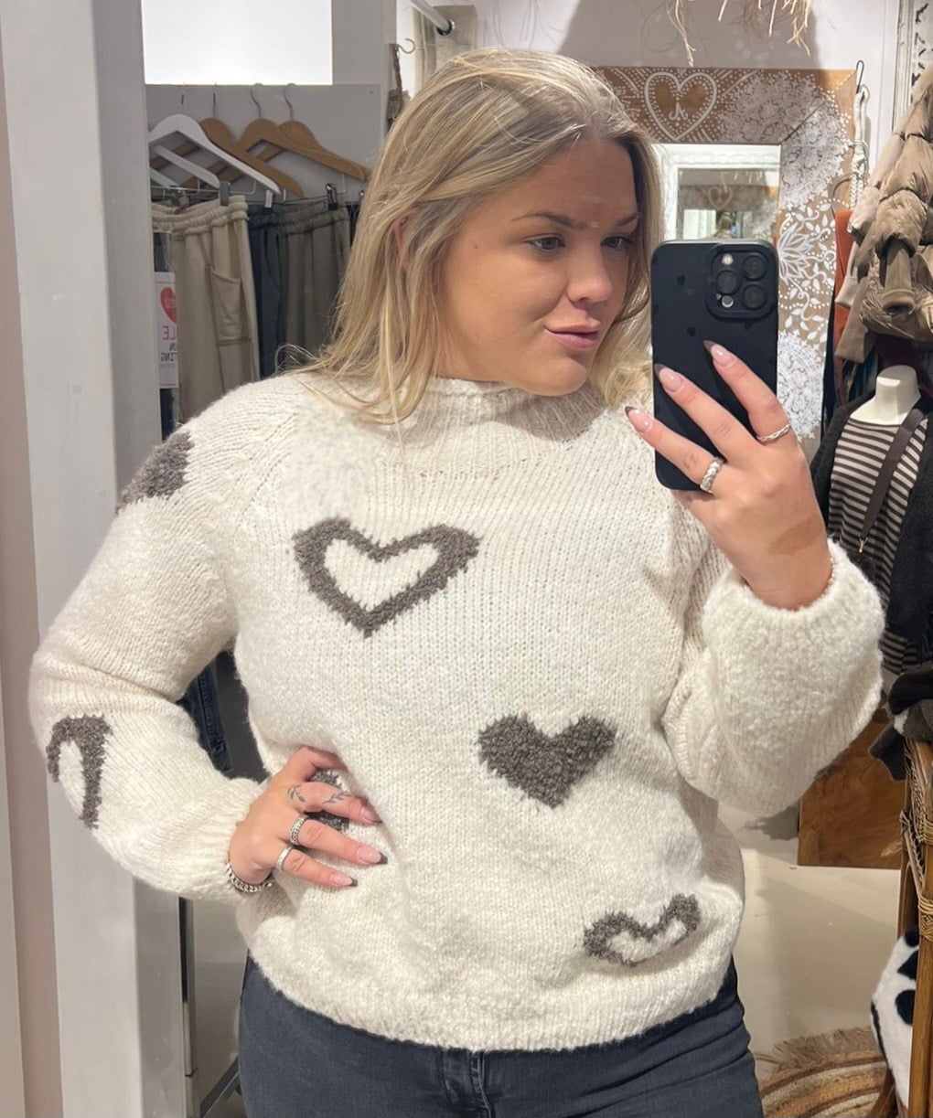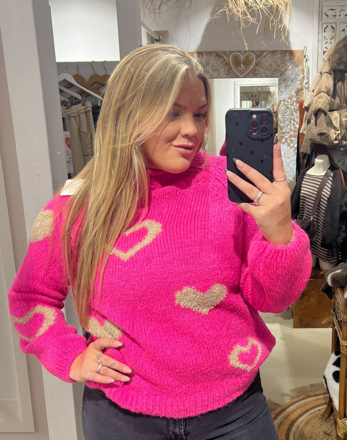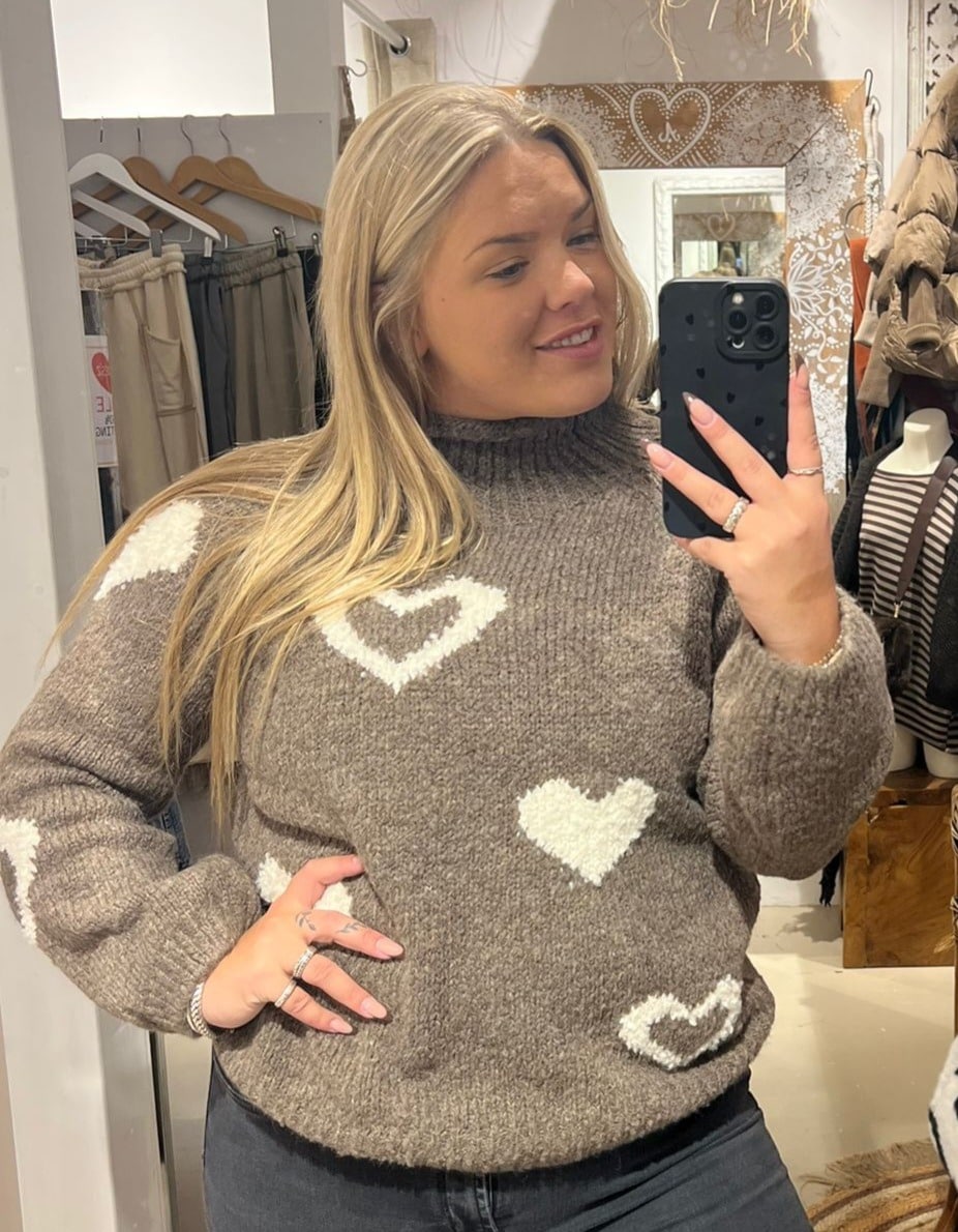 Leuke trui met opstaande boordje, acryl mix, één maat afgewerkt met vrolijke hartjes, lekker warm én trendy
