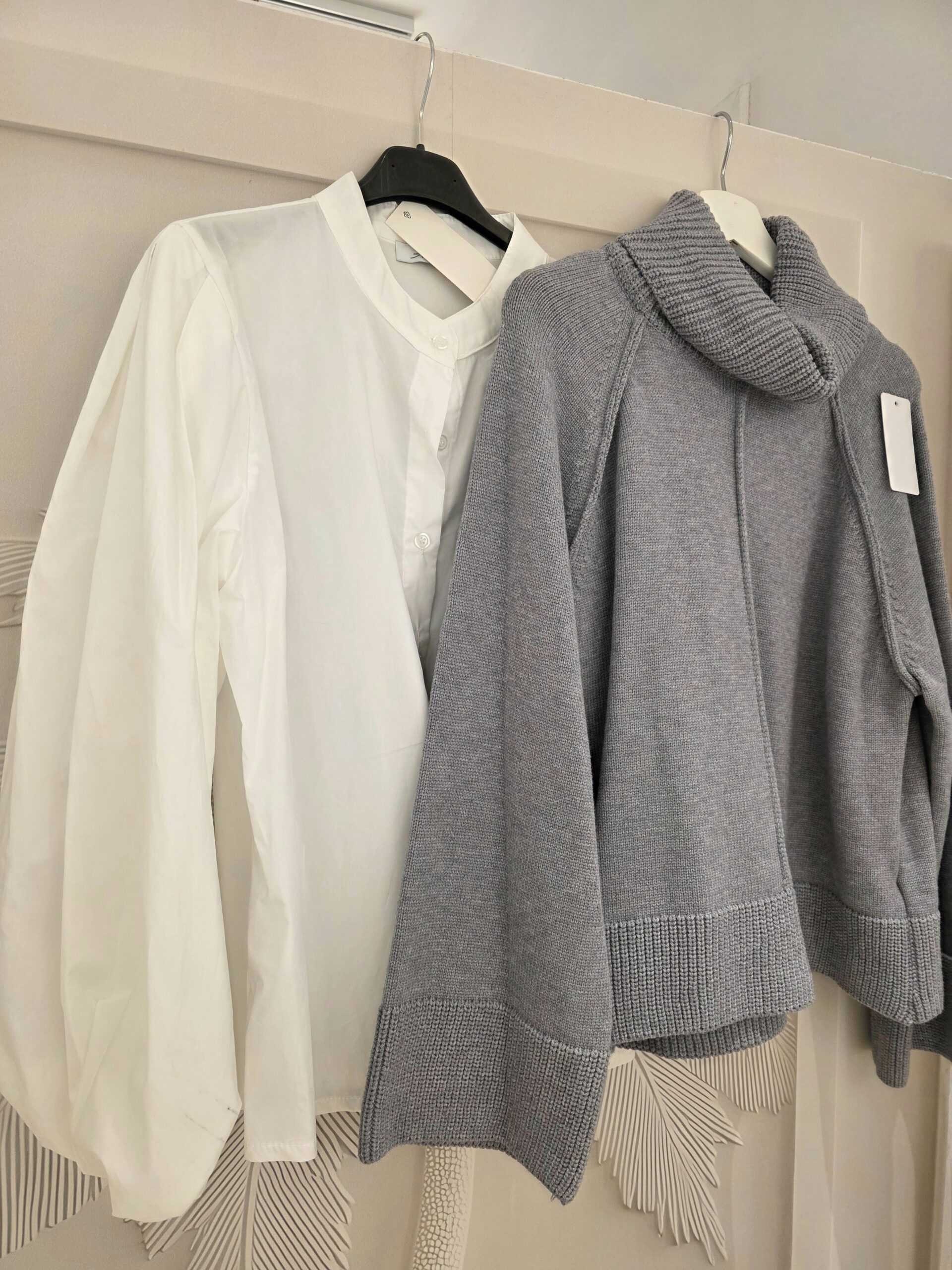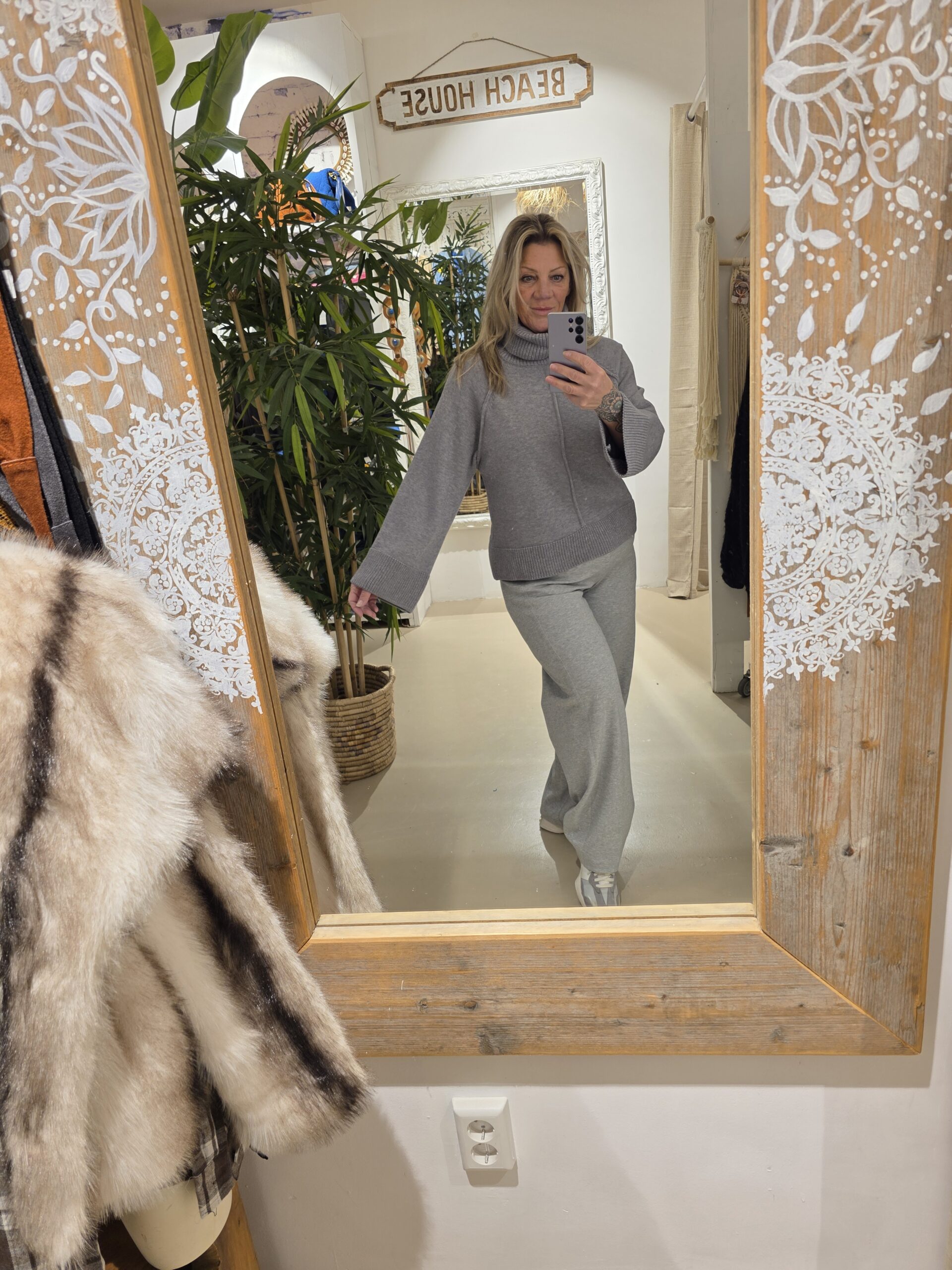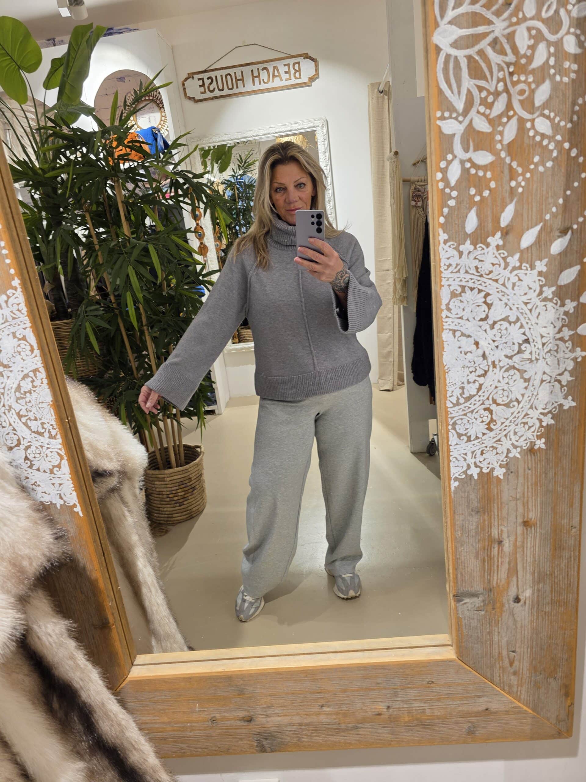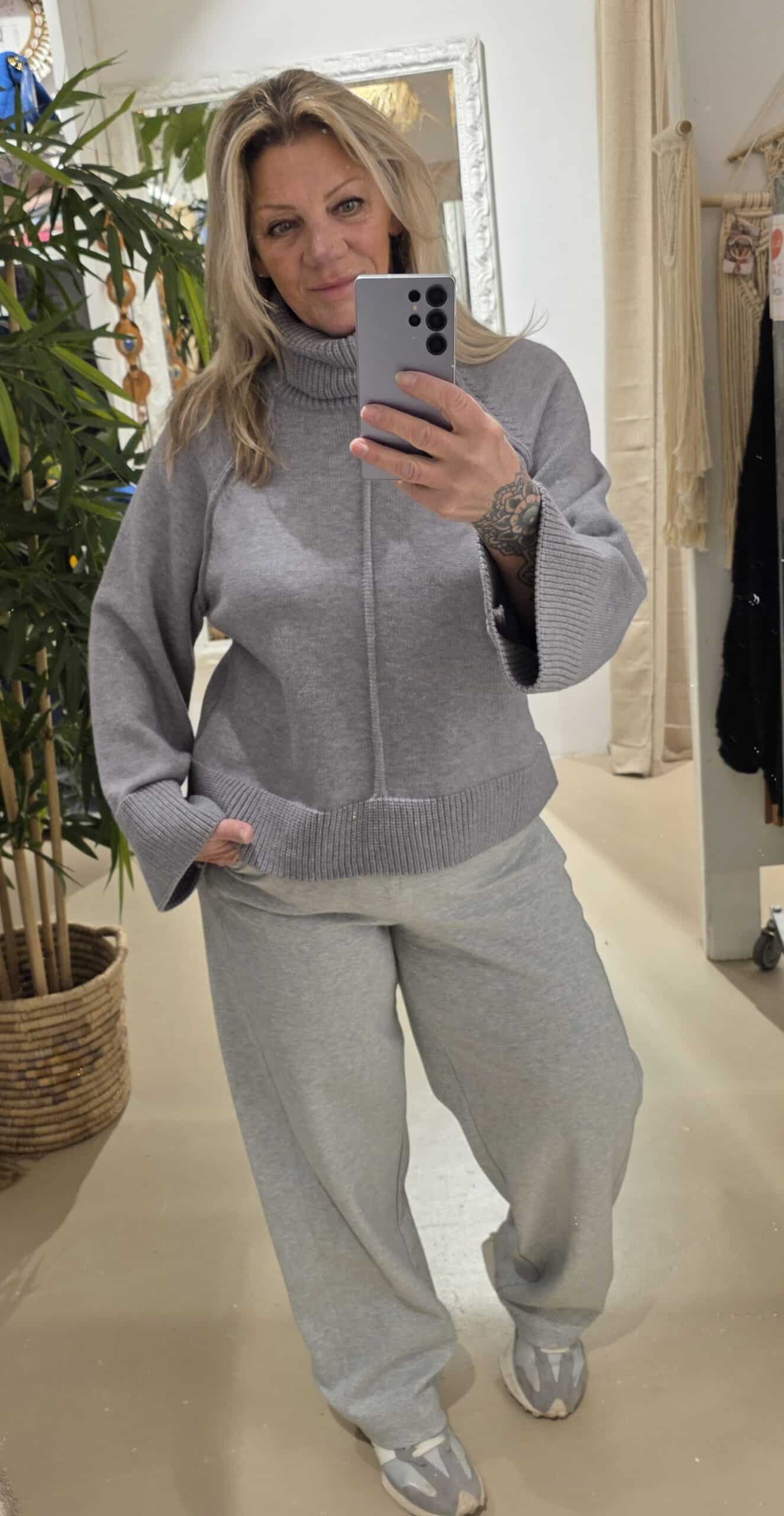 In een mooie kleur grijs, combineert echt overal bij, kort model met wat zichtbare naden en vooral de wijde manchetten zijn erg trendy, én natuurlijk een mooie grove col, één maat in acryl mix