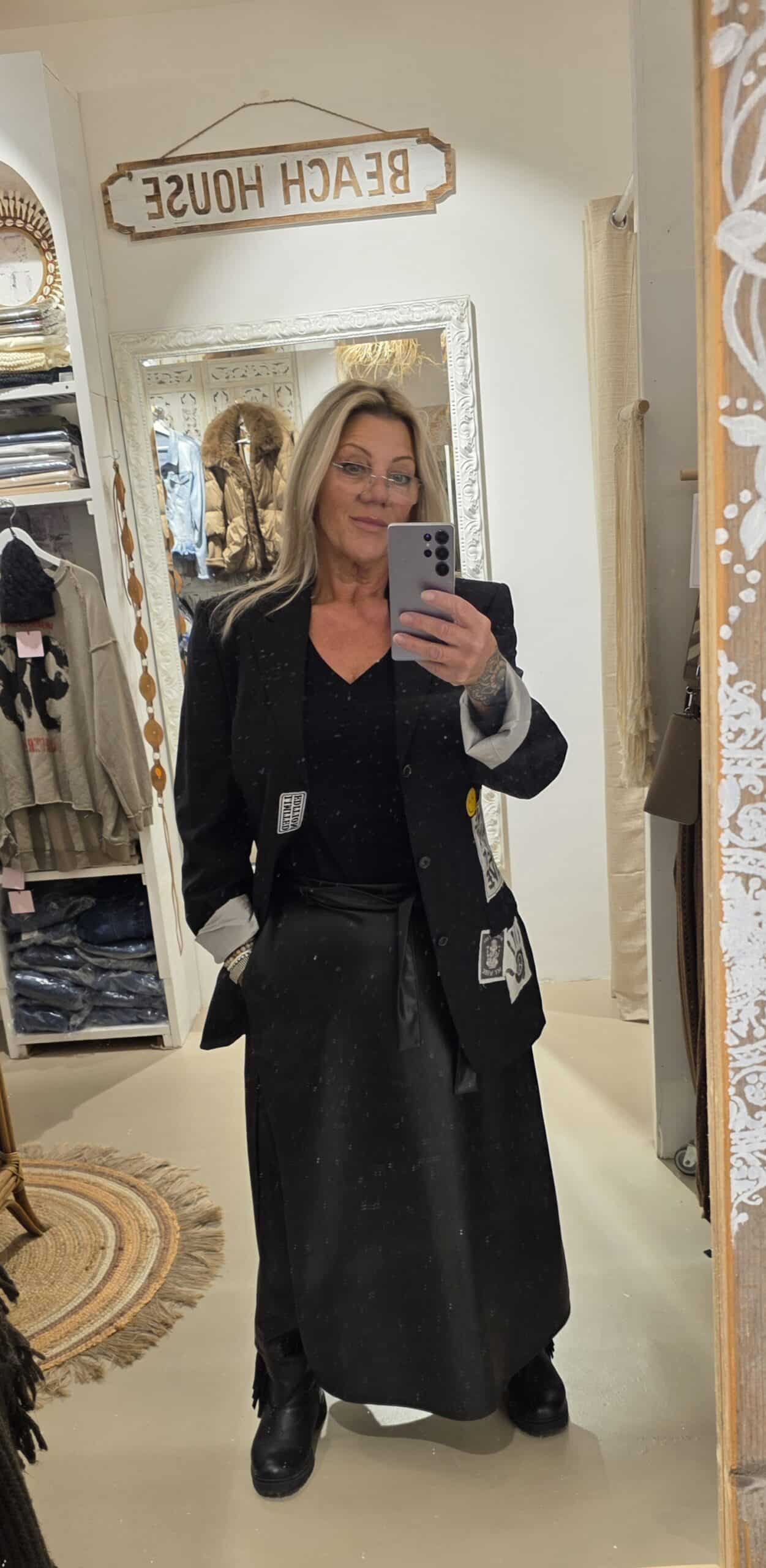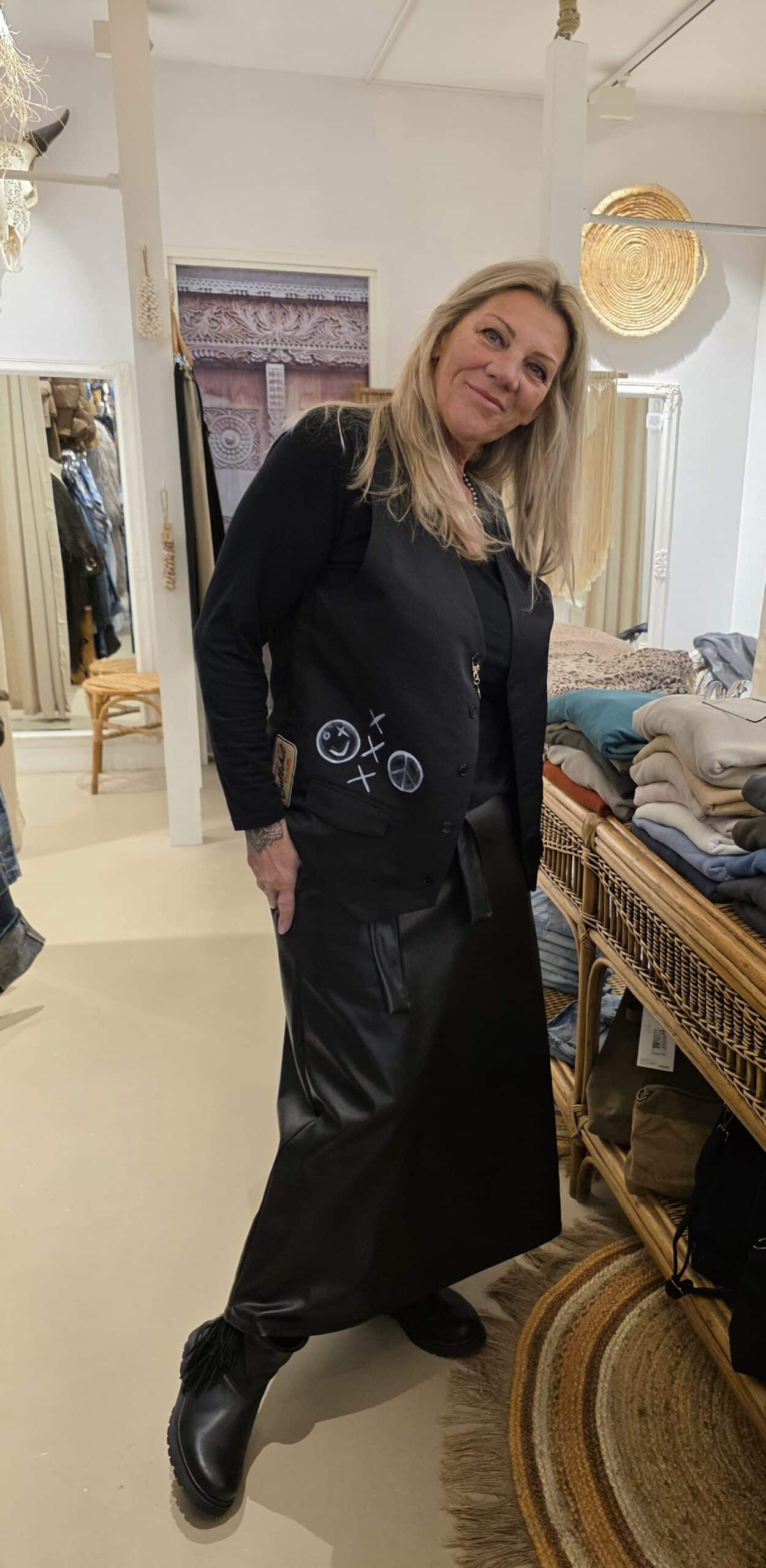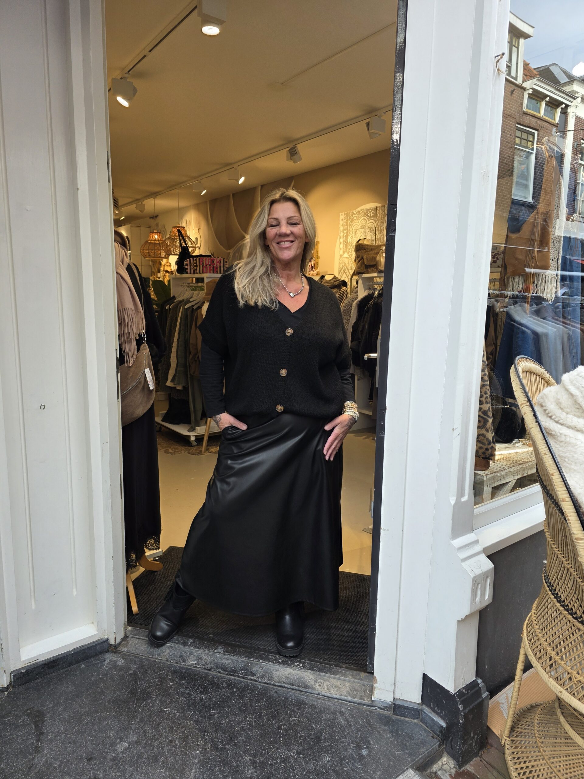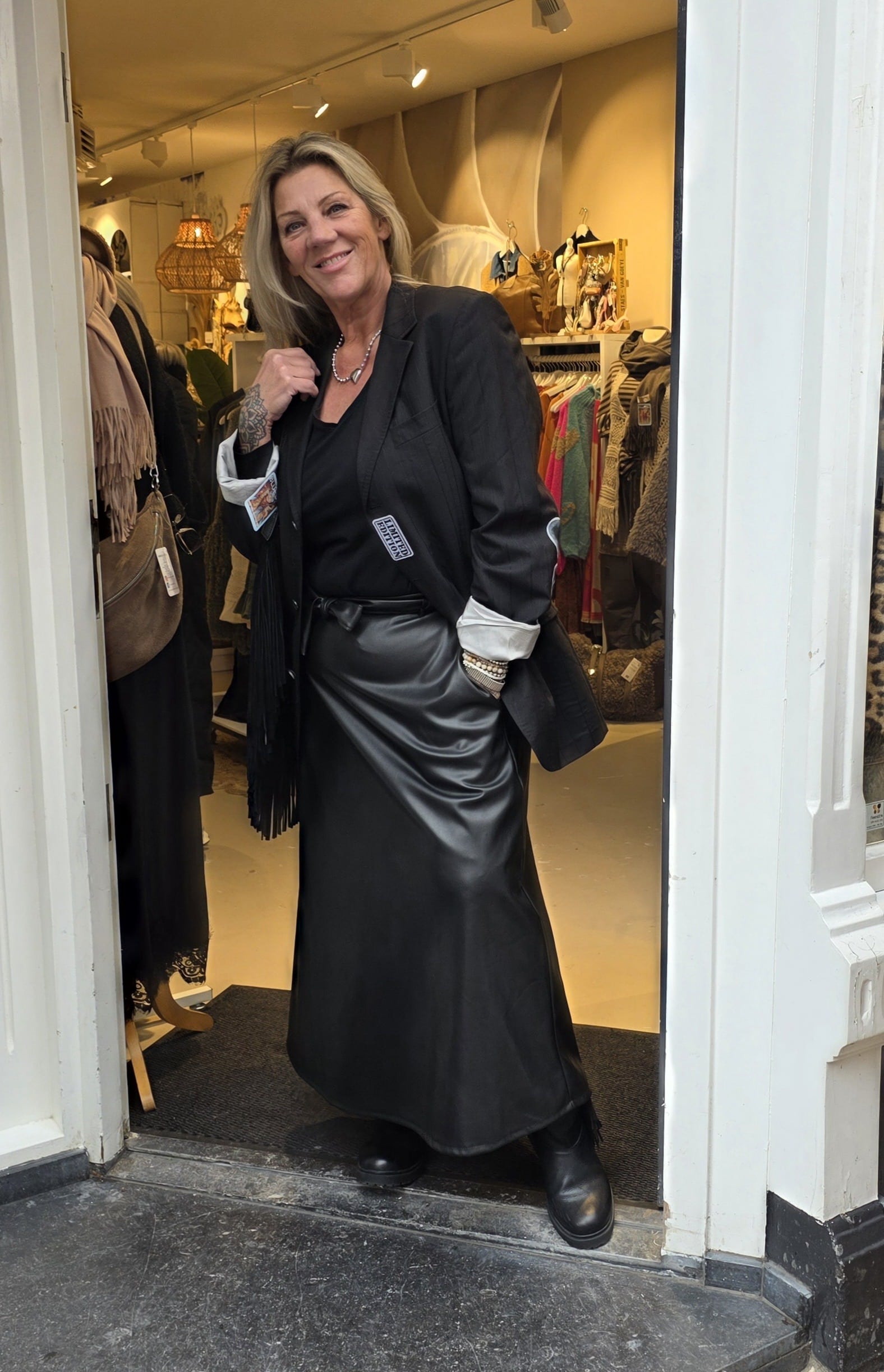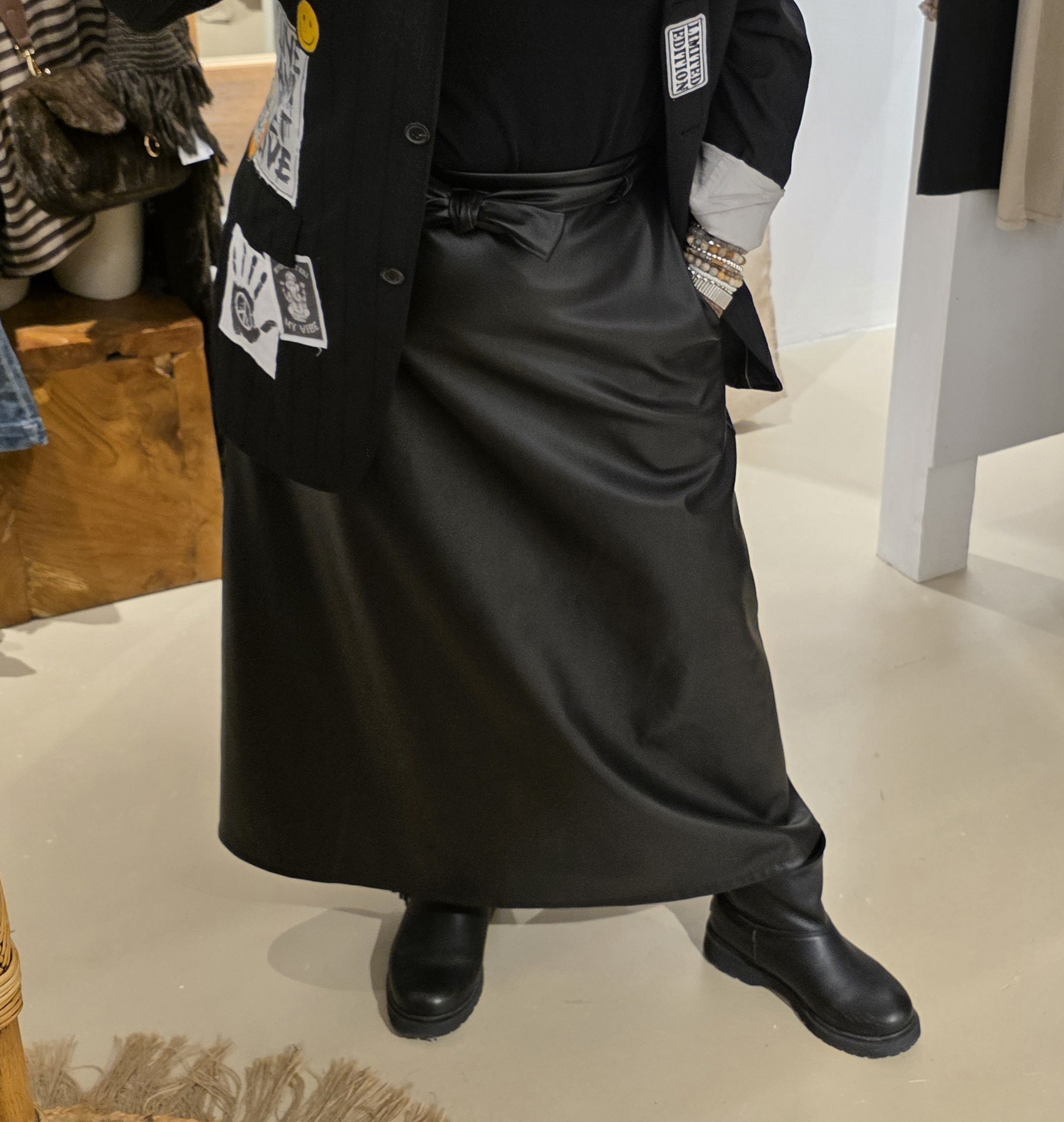 Van heel soepel fake leather, oftewel vegan leather, rok valt wijd uitlopende, heeft een elastische tailleband achter en wordt geleverd met een losse riem van hetzelfde materiaal, de riem kun je op diverse manieren strikken, heerlijke zachte soepele rok, valt ruim ook doordat er stretch in zi.