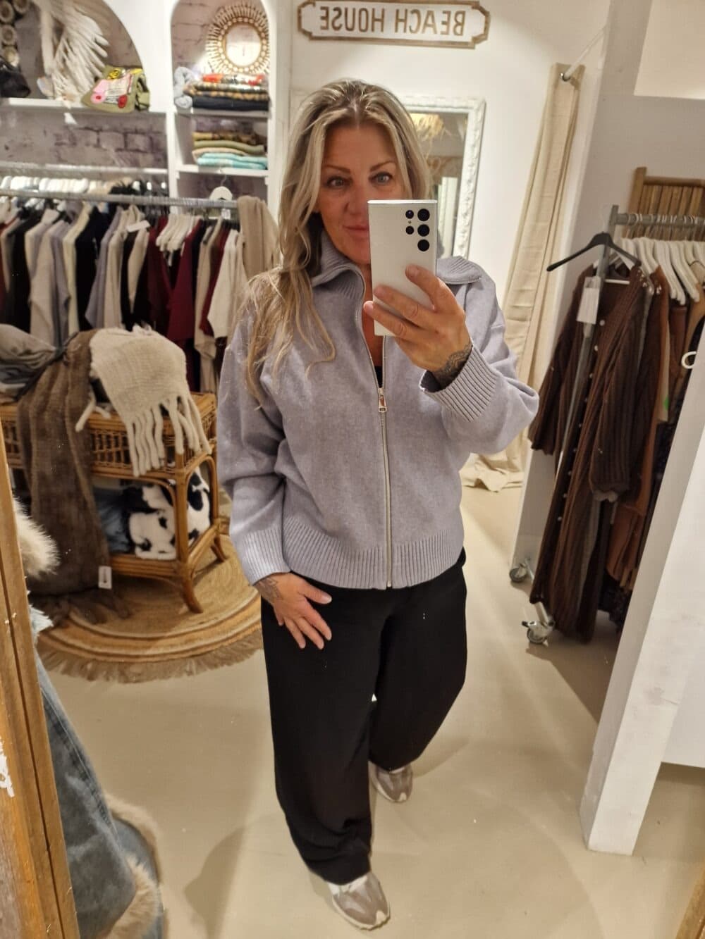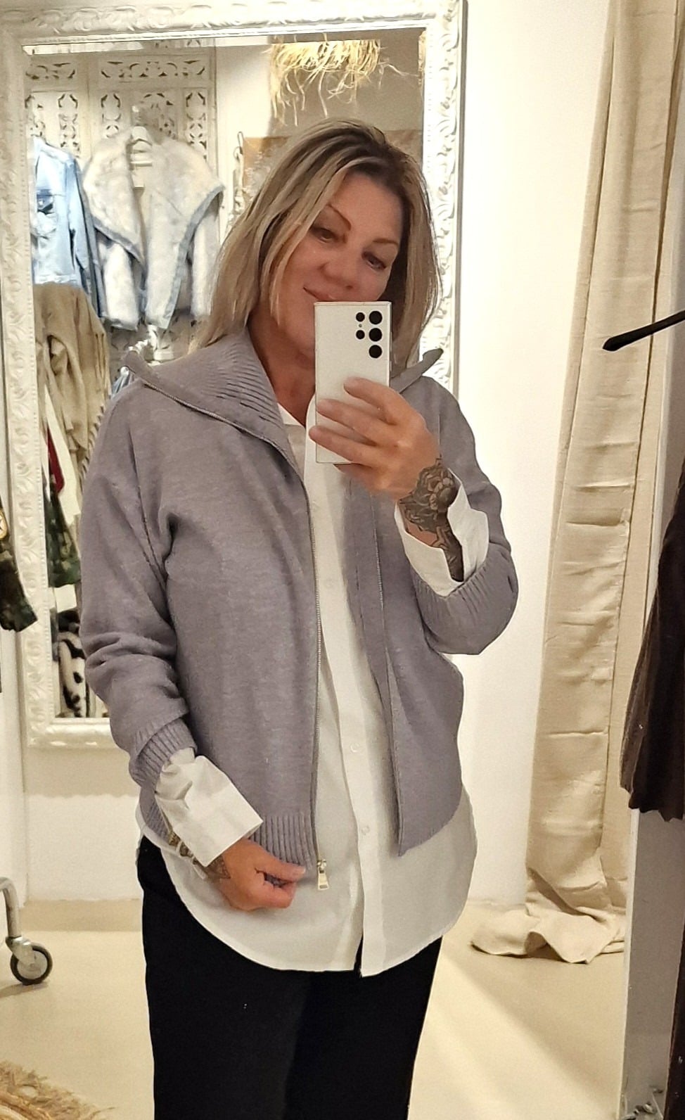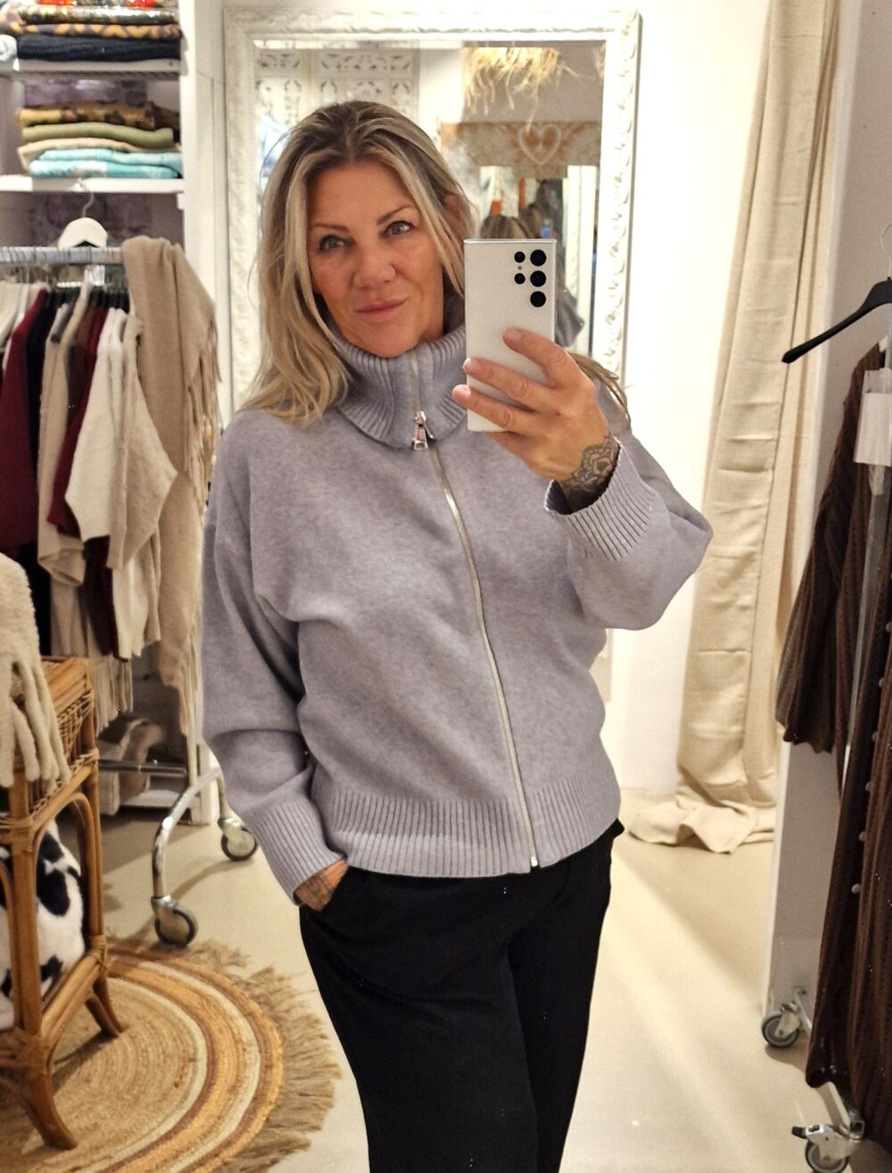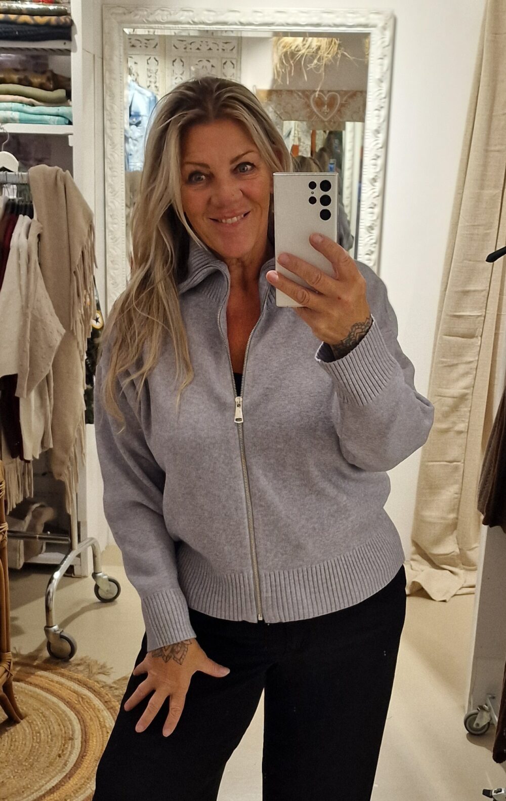 Mooi vestje met lange rits die doorloopt in de col, één maat in acryl mix, mooi glad materiaal, past tot ongeveer 42/44, mooie lange col