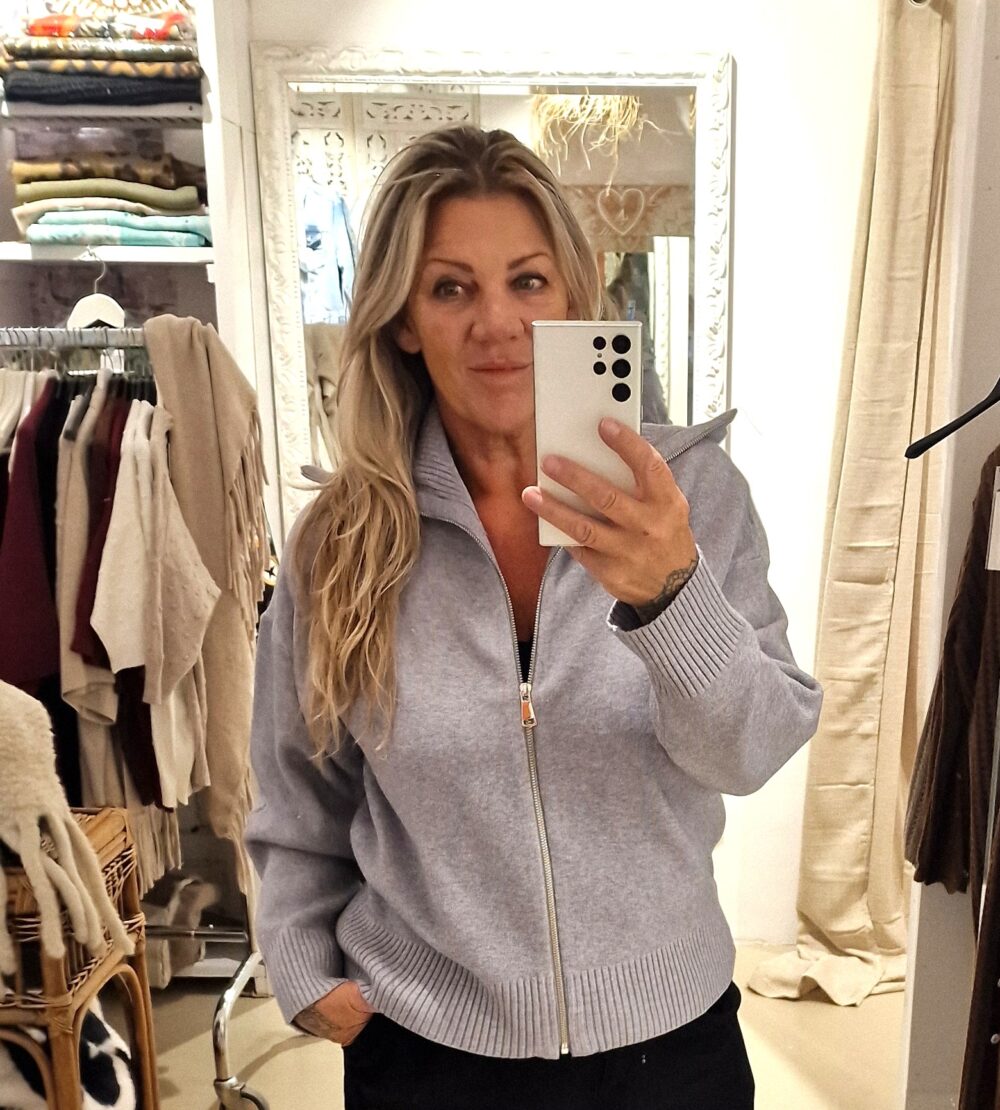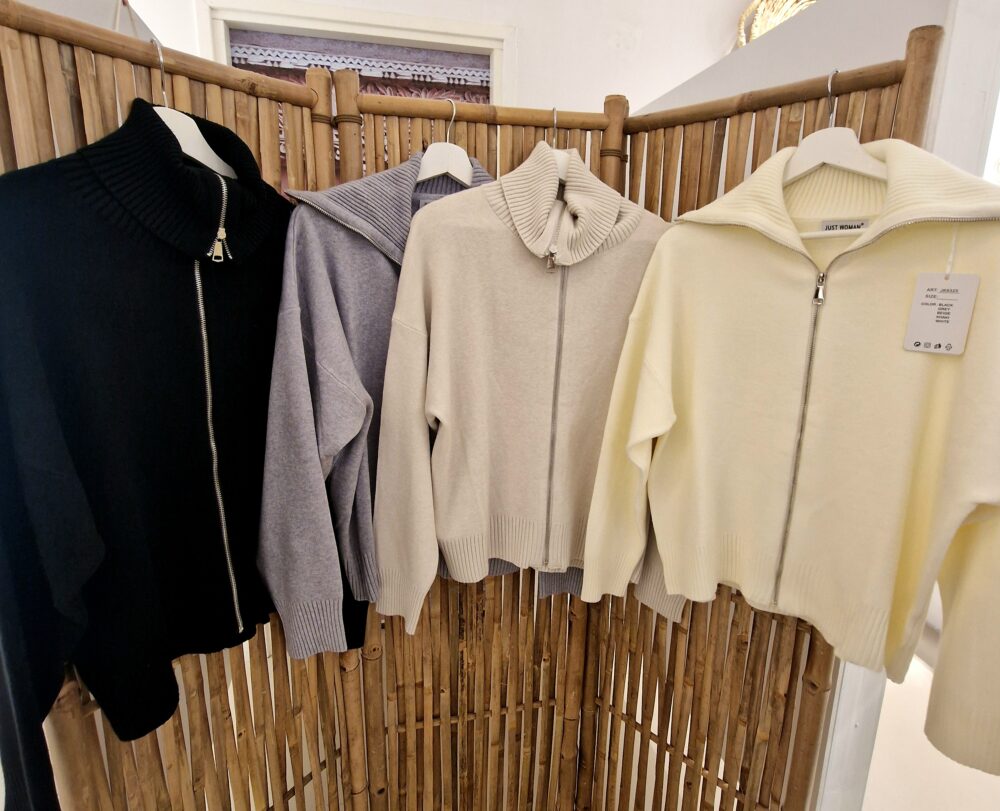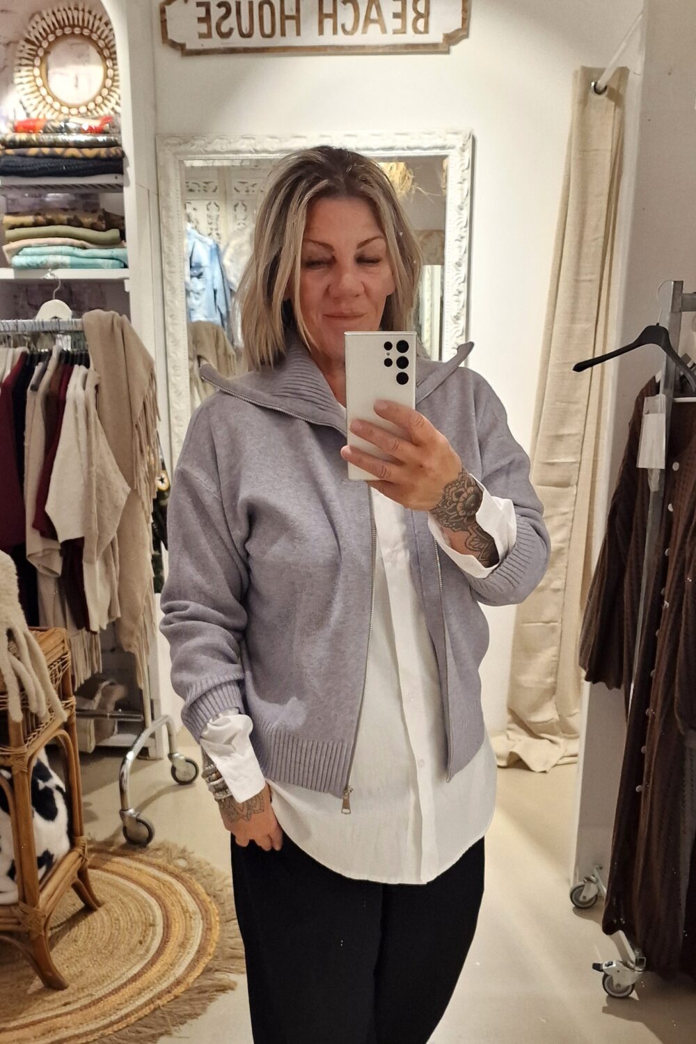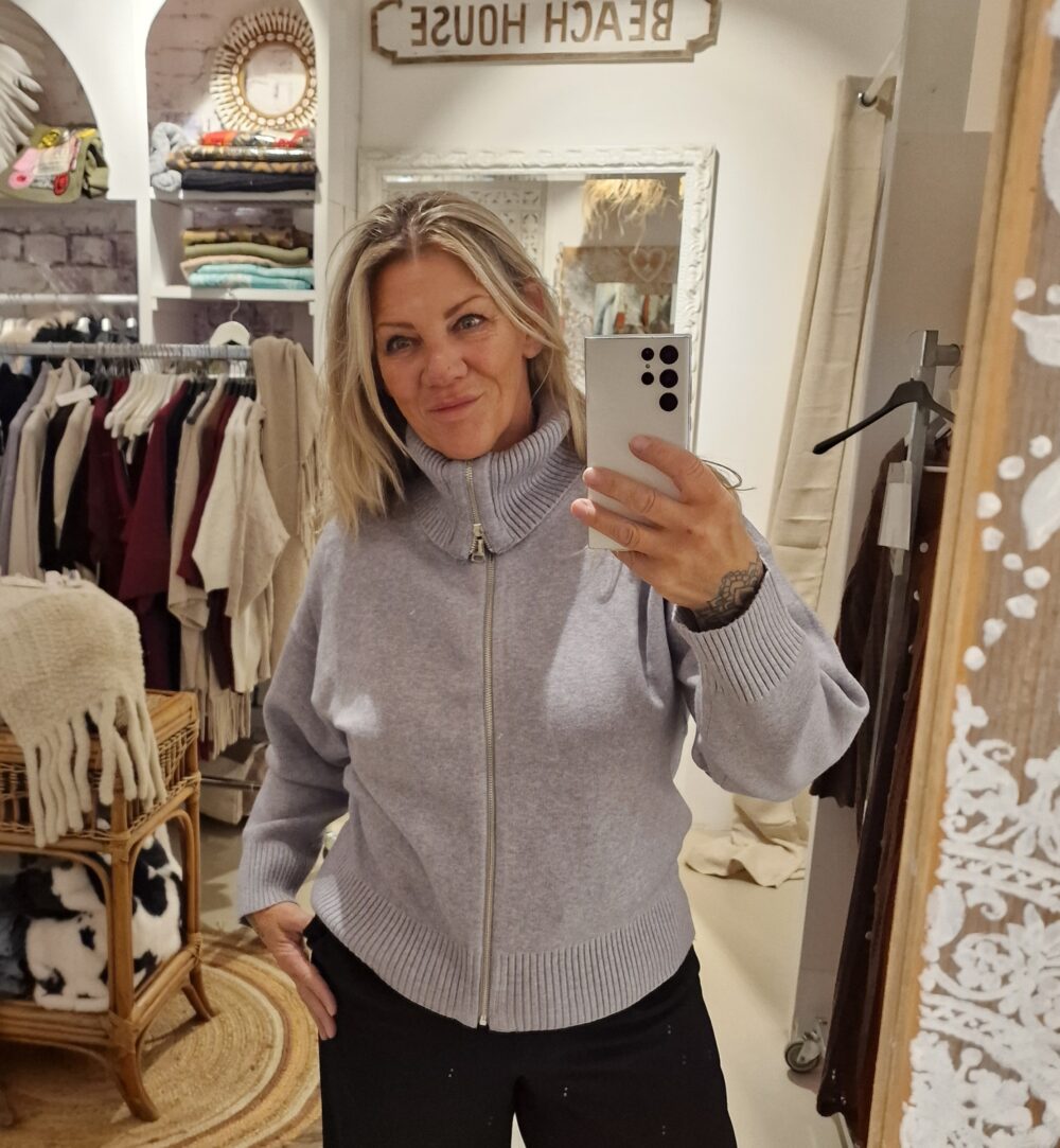 Mooi vestje met lange rits die doorloopt in de col, één maat in acryl mix, mooi glad materiaal, past tot ongeveer 42/44, mooie lange col