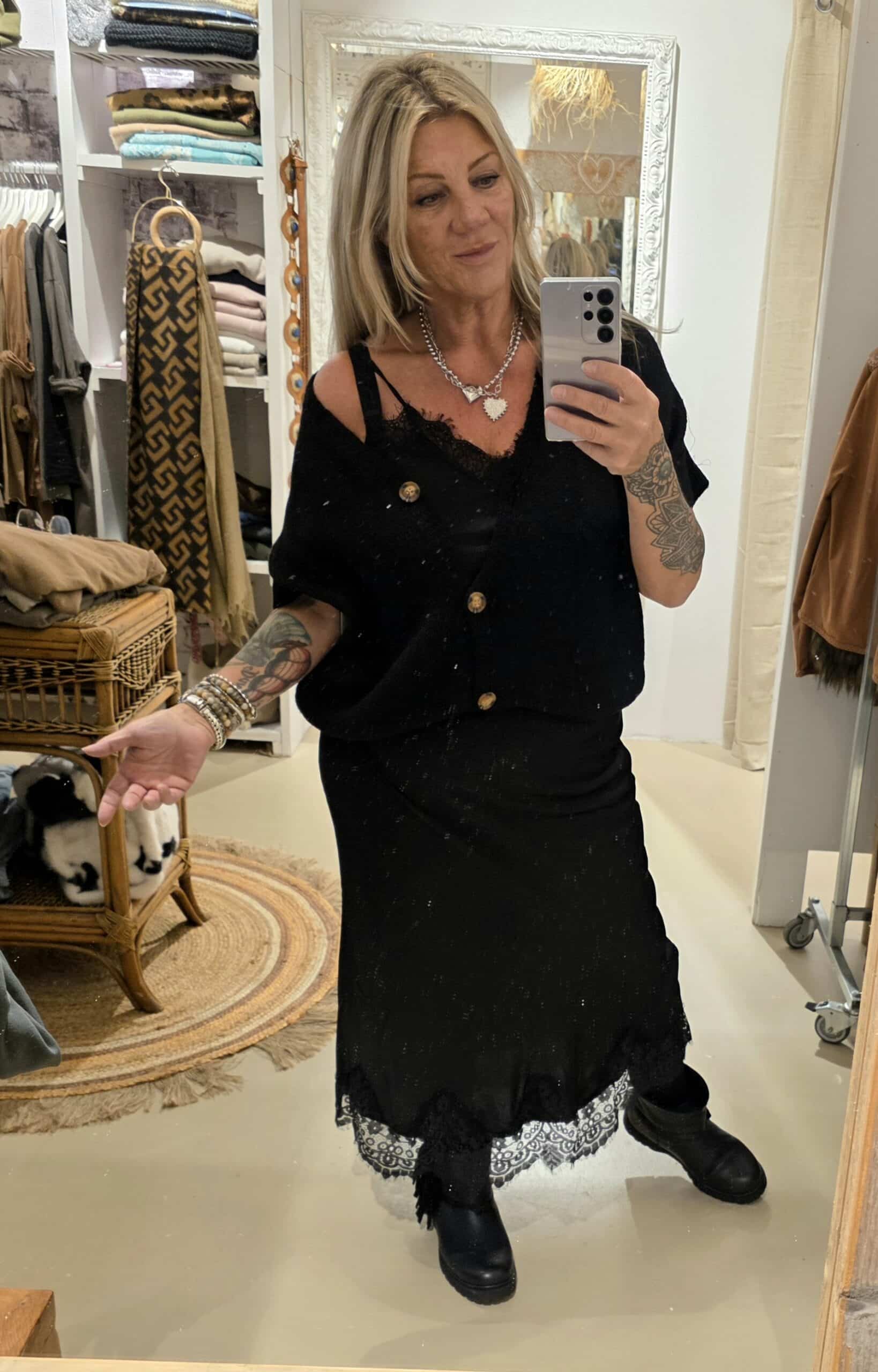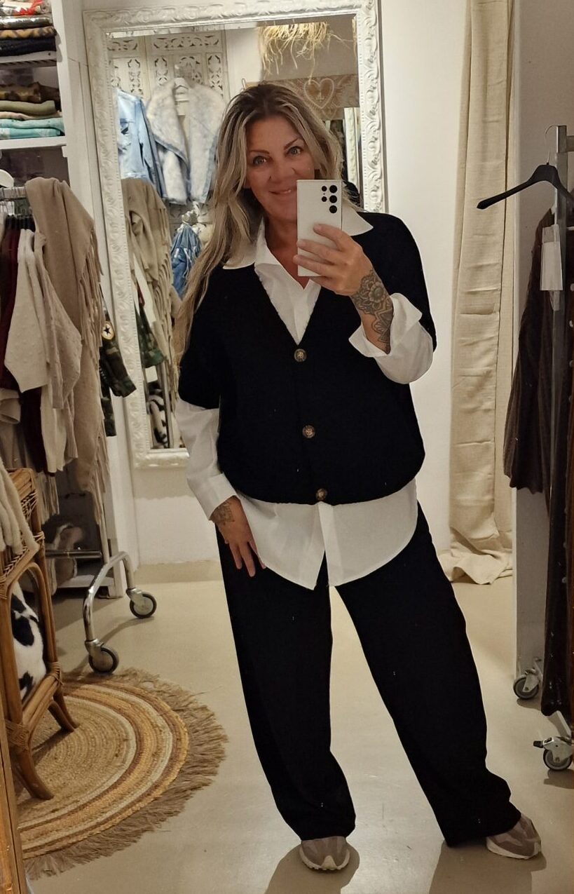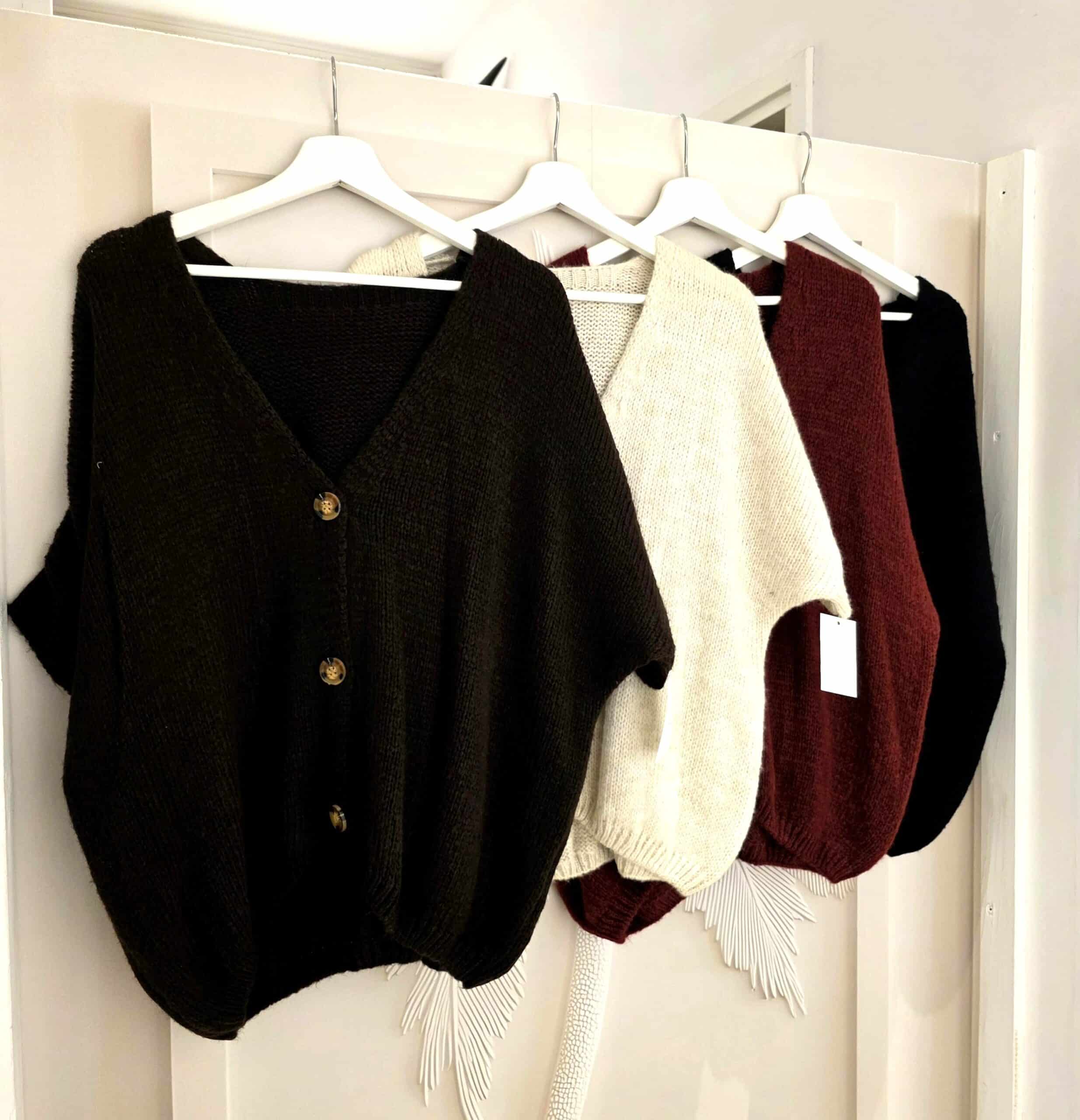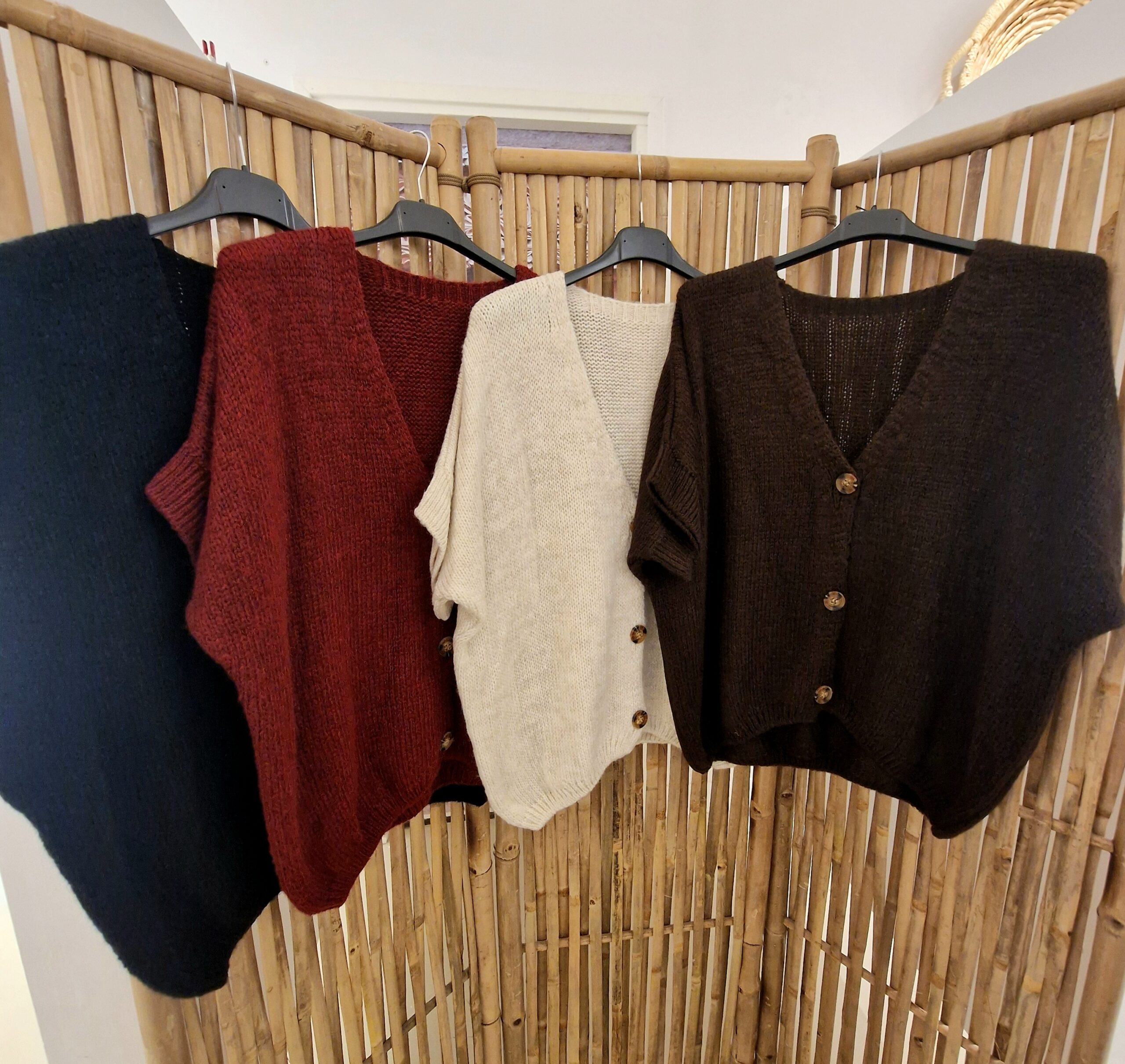 heerlijk ruim vestje met kortere mouw en leuke knoop, één maat in een acrylmix, leuk te combineren met een blousje of colletje.