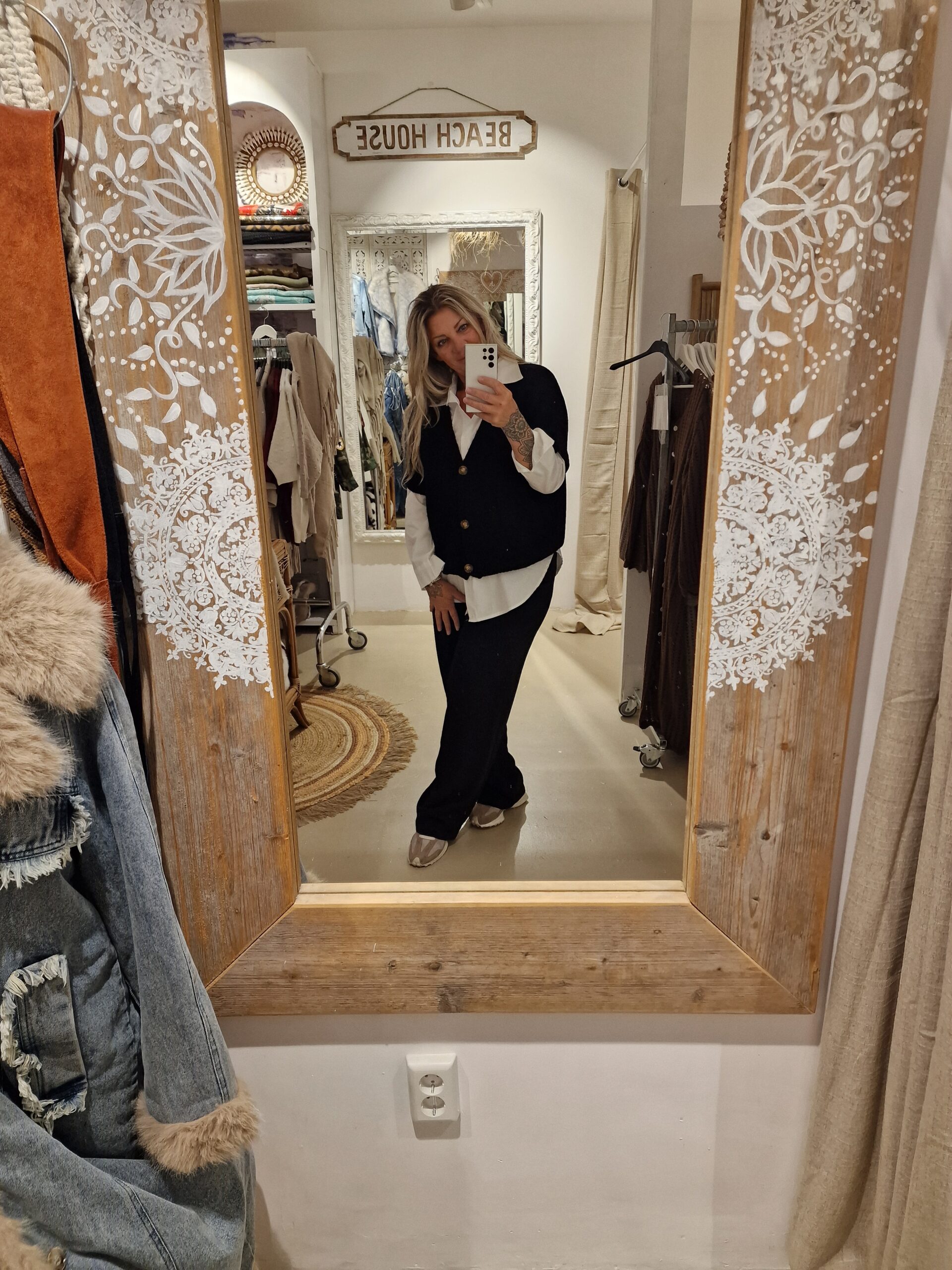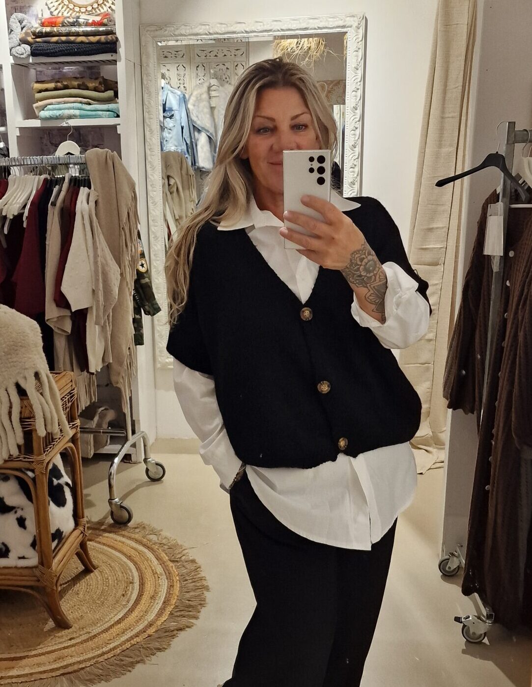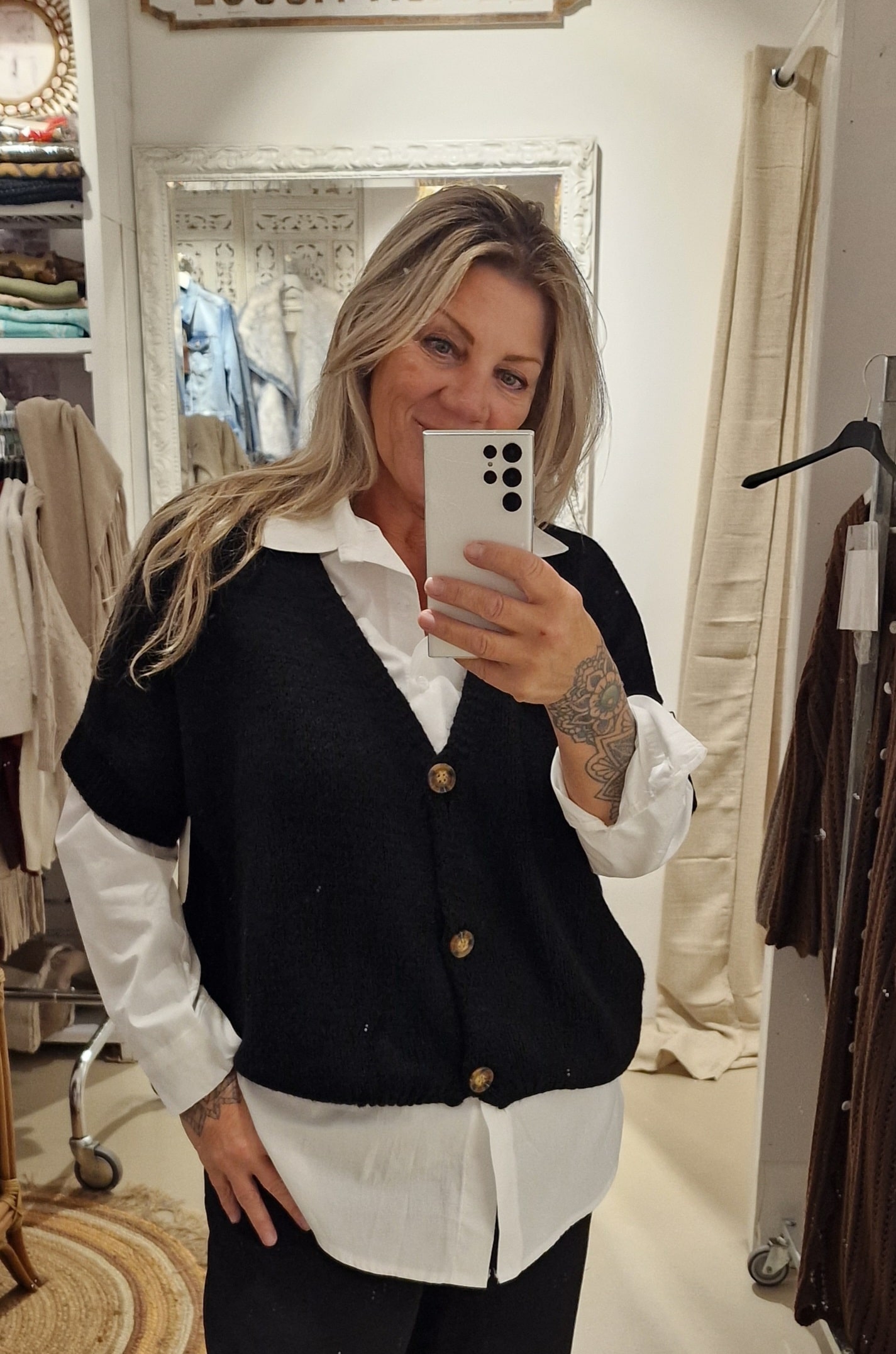 heerlijk ruim vestje met kortere mouw en leuke knoop, één maat in een acrylmix, leuk te combineren met een blousje of colletje.