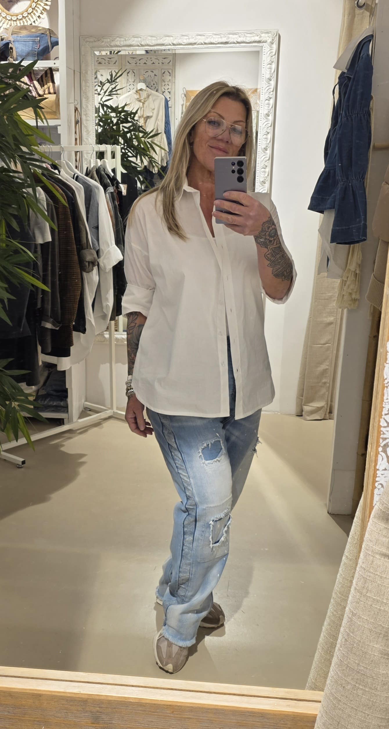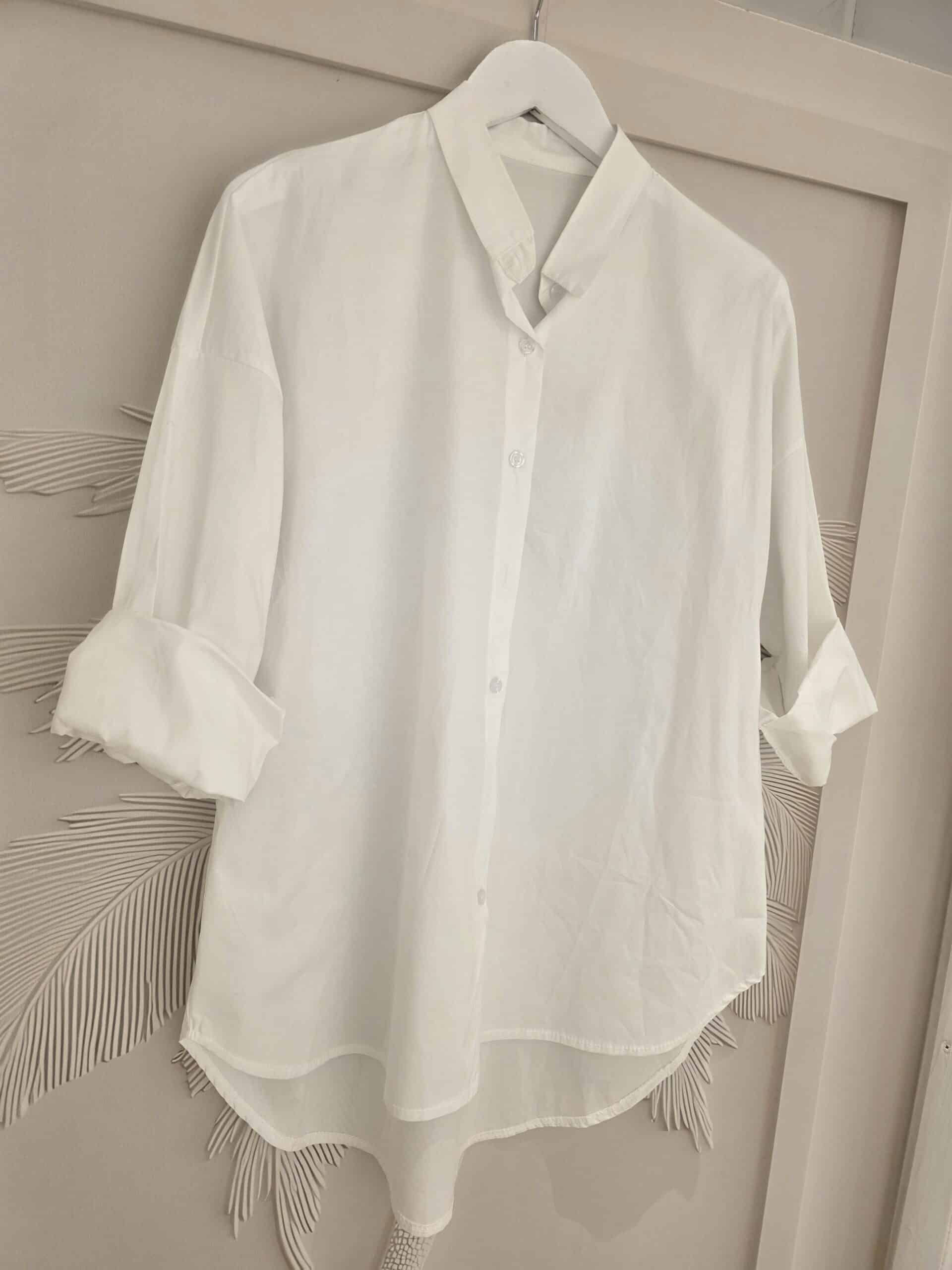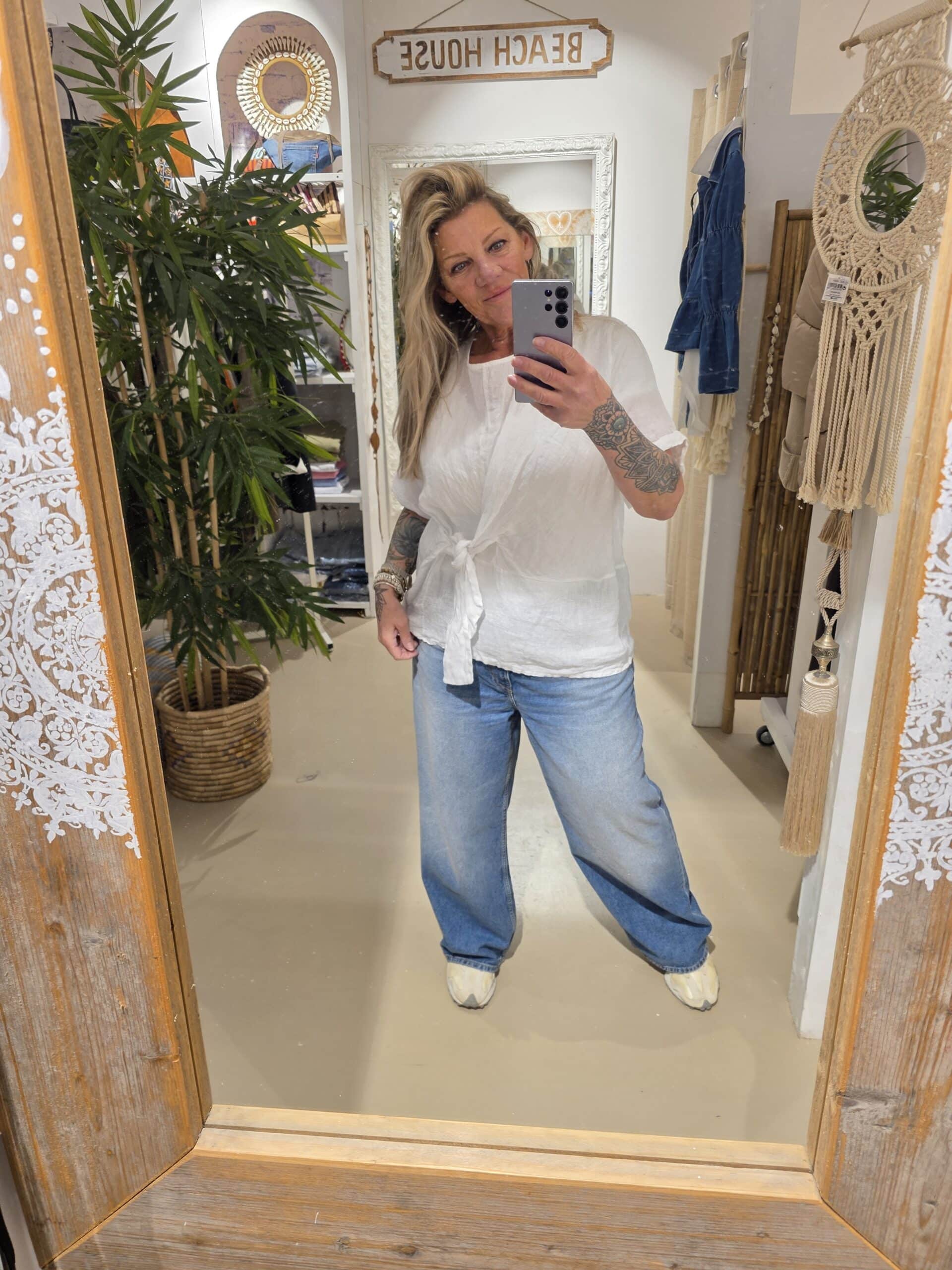 Mooi lekker fris wit katoen, altijd goed! Één mast past zeker tot 44, de blouse zijkanten onder lopen in een V model, zeer gunstig voor een slankmakend effect.mouwen zijn midi, maar je draagt ze vooral opgerolt.