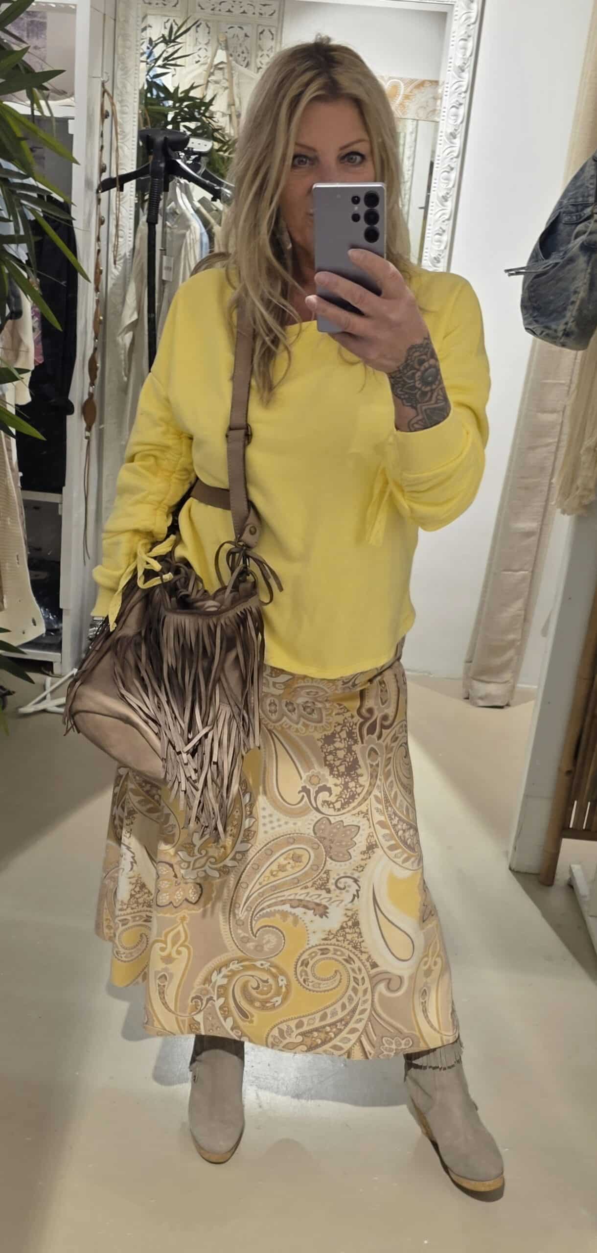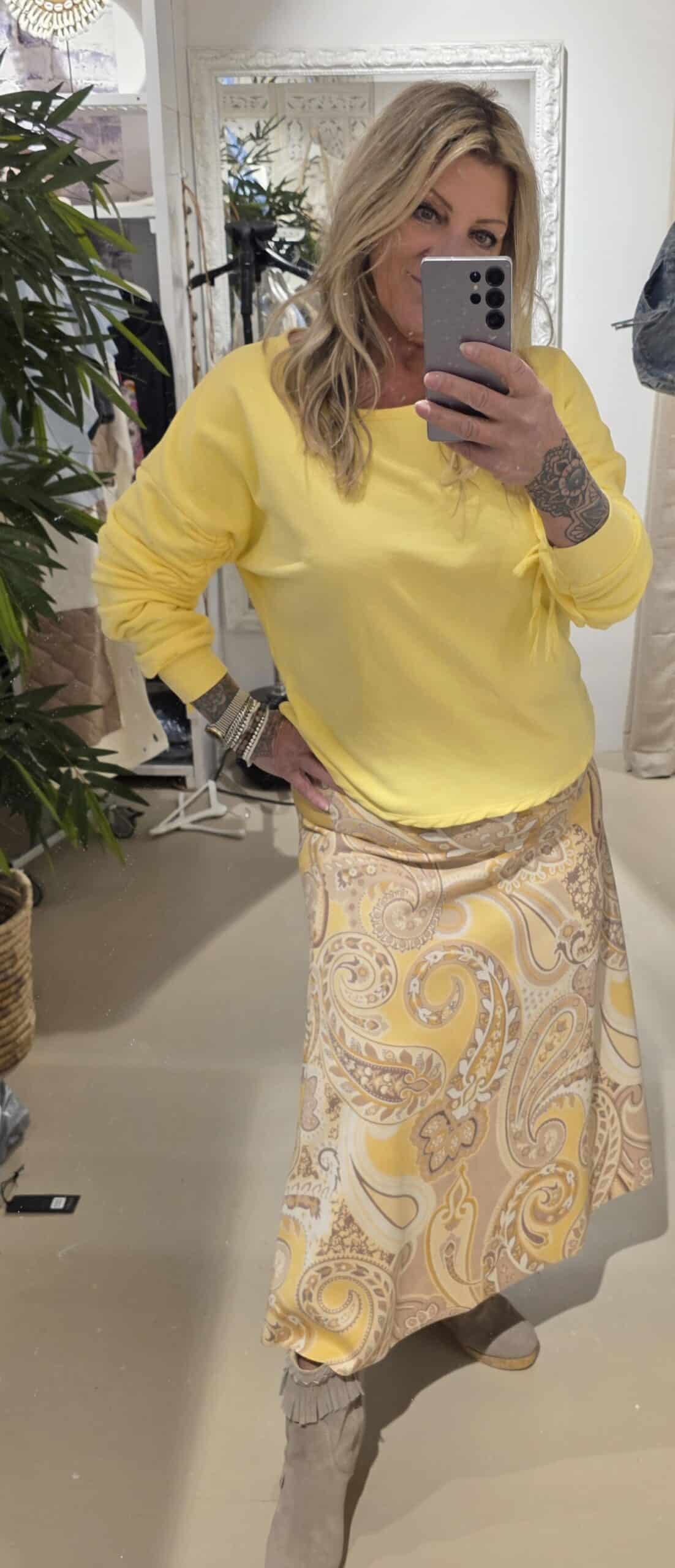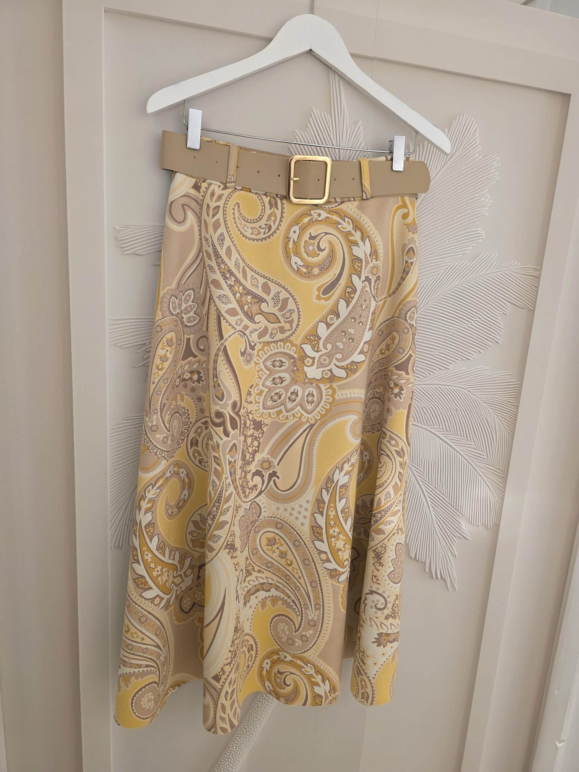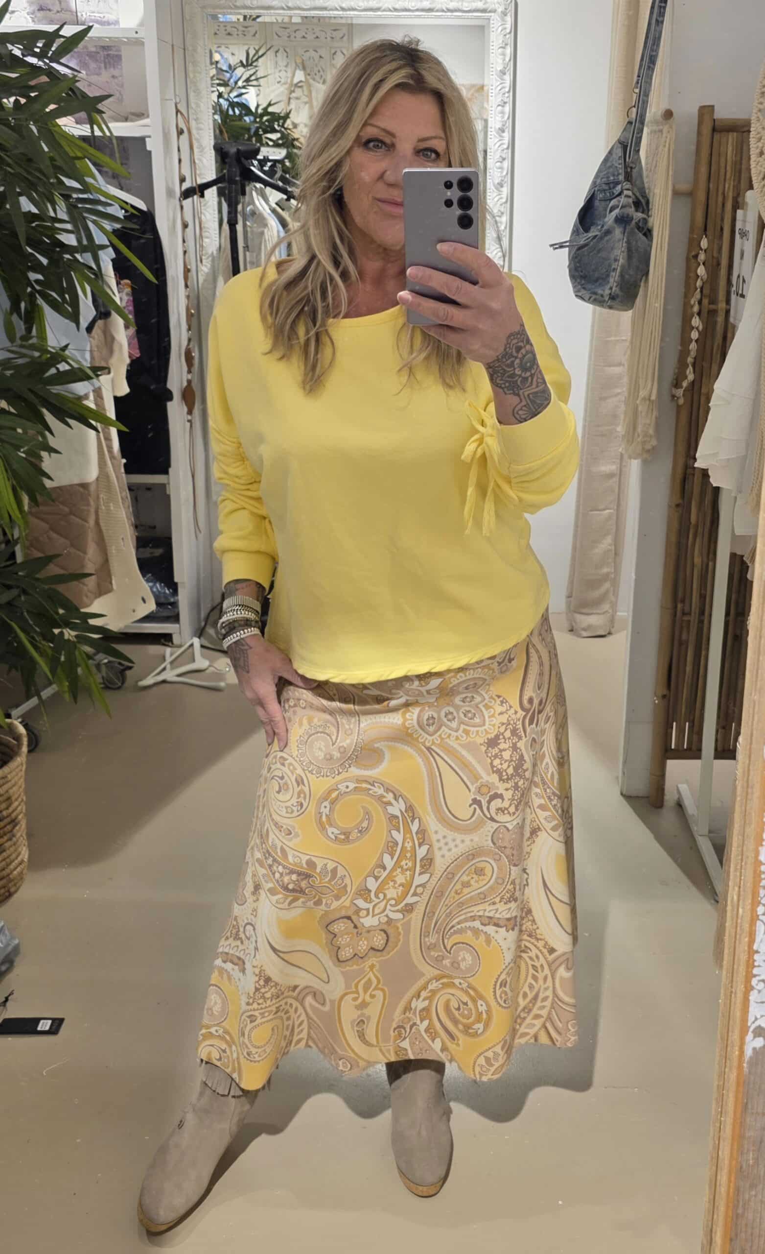 Heerlijk printje met geel, beetje retro look, stretch één maat, past tot ongeveer 42 goed, ook 44, maar dan is het wel leuker als je er iets overheen draagt, zie foto😉 midi lengte beetje A lijn model.